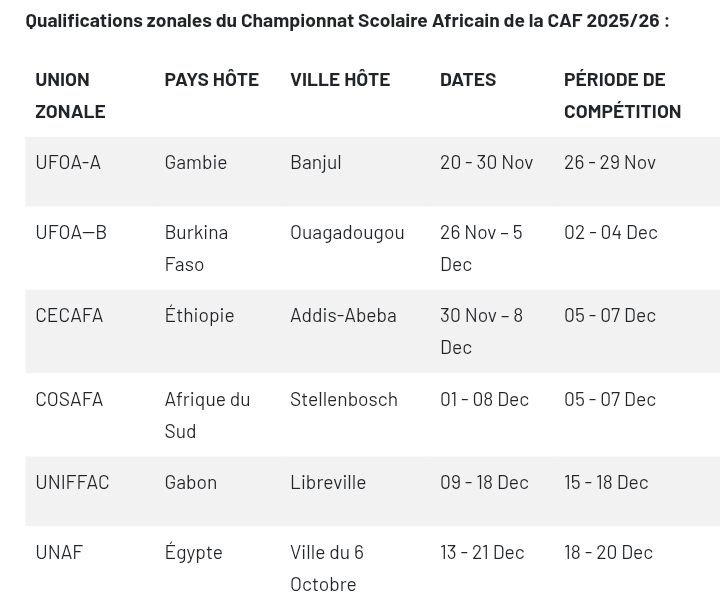 La Confédération Africaine de Football (CAF) a officialisé ce jour les dates et lieux des tournois zonaux du Championnat Africain de Football Scolaire 2025/26, une compétition qui allie sport, éducation et formation.