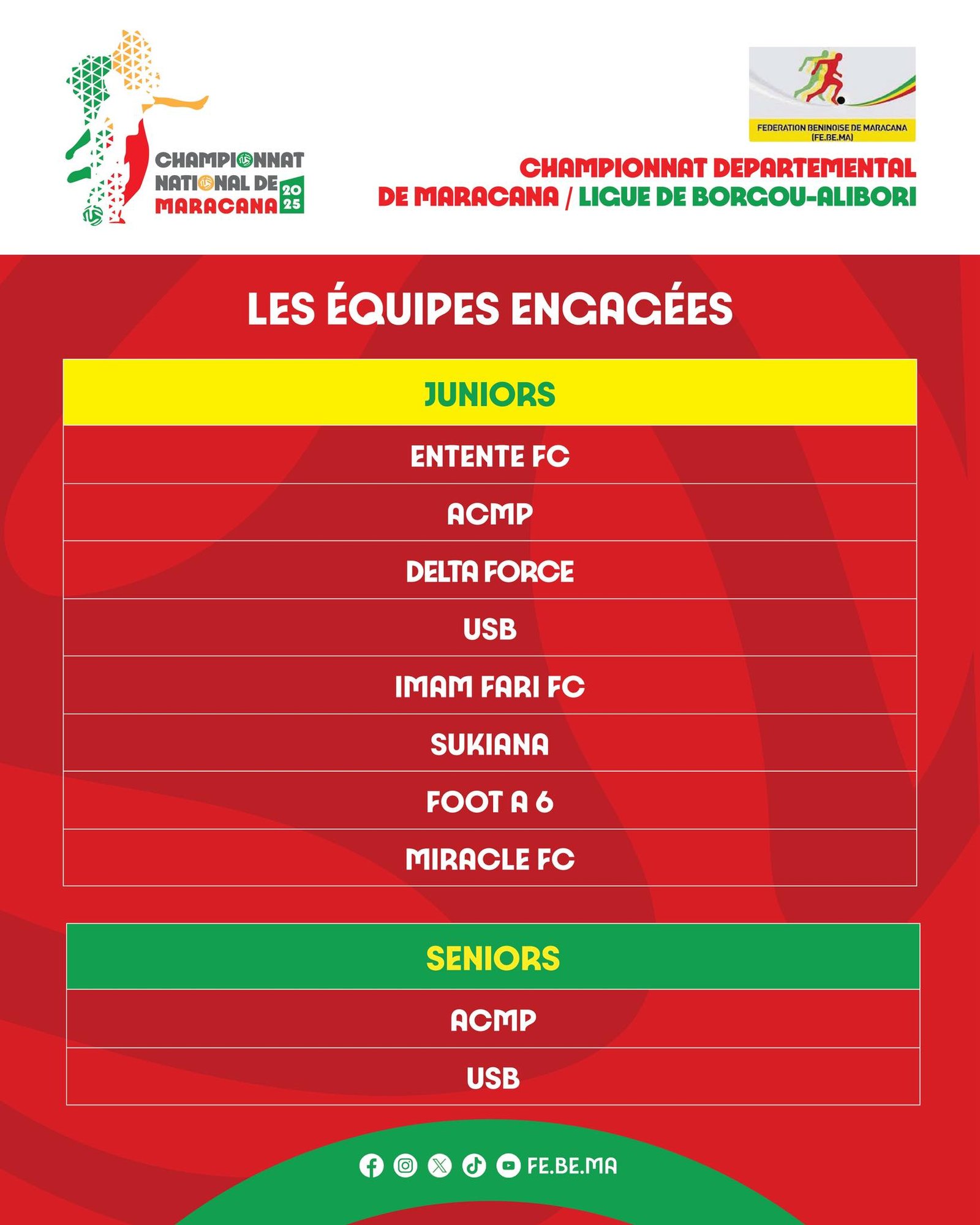 Au total, dix équipes ont participé au championnat organisé par la ligue Borgou-Alibori de Maracana. Huit formations étaient engagées en Juniors : Entente FC, ACMP, Delta Force, USB, Imam Fari FC, Sukiana, Foot à 6 et Miracle FC. Deux équipes ont concouru en Séniors : l’ACMP et l’USB.