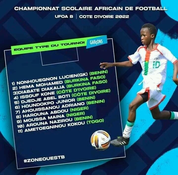 Ils sont au total trois jeunes joueurs du CEG sainte Rita du Bénin à être désigné dans l’équipe type du tournoi du championnat Scolaire Africain Garçons UFOA-B qui s’était passé en côte d’ivoire du vendredi 11 au dimanche 13 novembre 2022. Il s’agit de NONHOUEGNON Lucien, Houdokpo Junior et de Arouna Nazirou respectivement gardien de but, milieu de terrain et de l’attaquant.