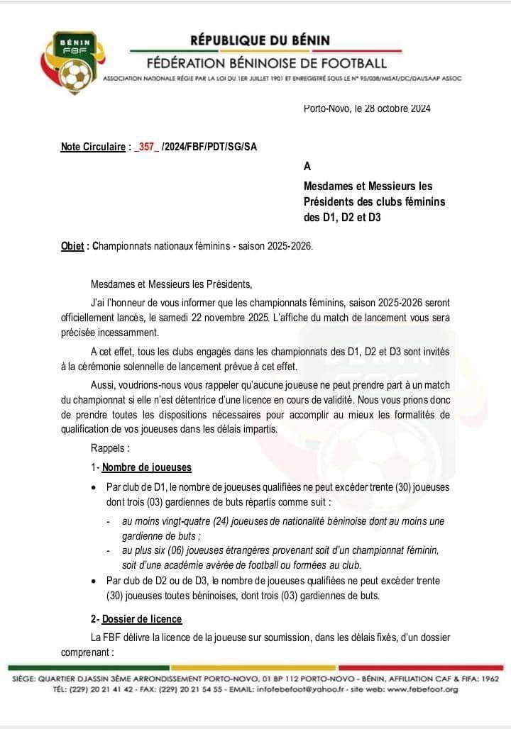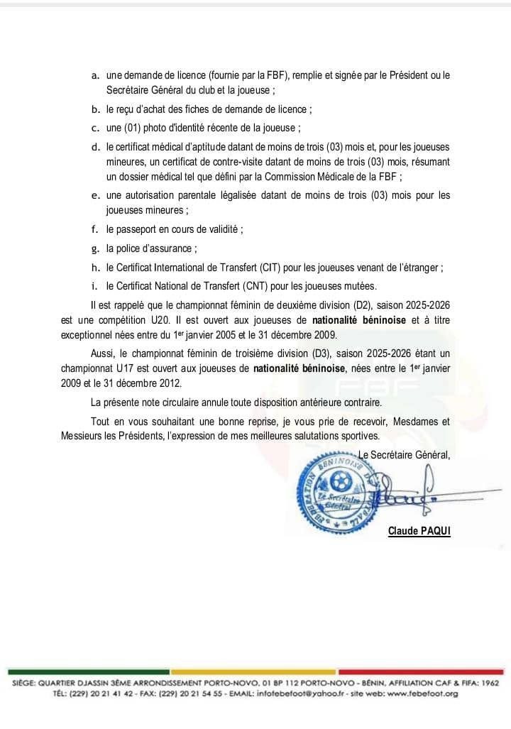 Le Secrétaire Général a également rappelé que les championnats de D2 et D3 sont respectivement réservés aux joueuses U20 et U17 de nationalité béninoise. Une mesure destinée à favoriser la formation et la promotion des jeunes talents locaux, en cohérence avec la politique de développement du football féminin menée par la FBF.