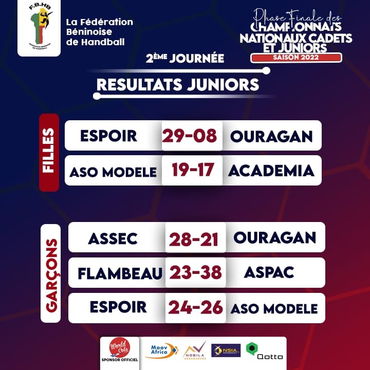 Débutés dans l’après midi de ce dimanche 19 février 2023, les championnats nationaux cadets et juniors World Cola 2022 se sont poursuivis ce lundi 20 février 2023. La deuxième journée de de cette compétition qui révèle les jeunes talents du handball béninois a encore offert du beau spectacle. Certaines équipes ont enchainé, d’autres se sont enfoncées…, voici les résultats.