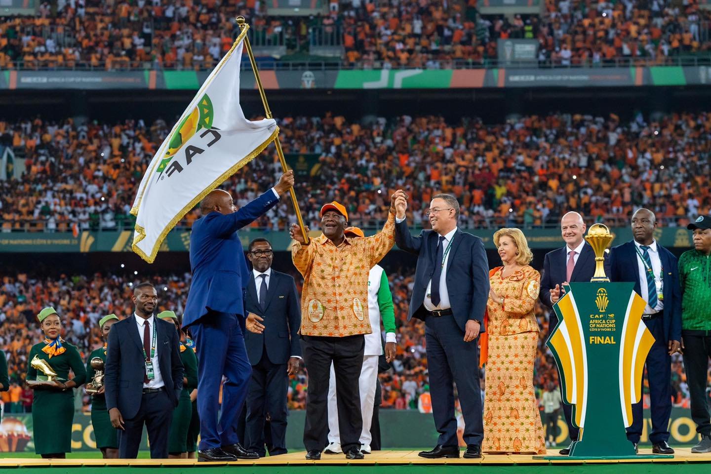 Dans un geste symbolique de camaraderie, une petite cérémonie de passation de flambeau s’est déroulée à la fin de la finale, en présence du président de la Fédération marocaine de football (FRMF), Fouzi Lekjaa. Des drapeaux du Maroc ont été hissés sur les écrans géants du stade d’Ebimpé, suscitant les acclamations enthousiastes du public ivoirien.
