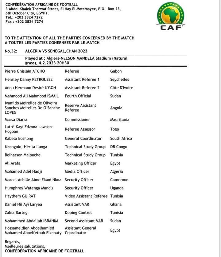 L’Algérie et le Sénégal se donnent rendez-vous ce samedi 04 février 2023 pour la grande finale du CHAN 2022. La CAF a rendu public la liste des officiels qui vont prester pour cette rencontre très attendue. Une liste sans arbitre béninois et c’est le Gabonais Pierre Ghislain ATCHO qui sera aux commandes.