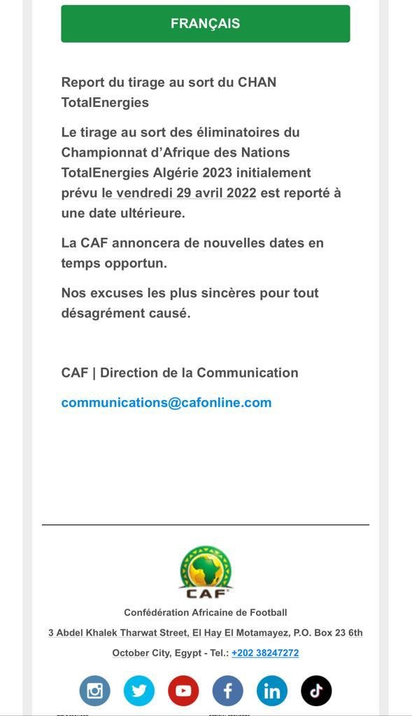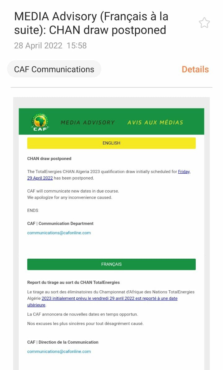 Le tirage au sort des éliminatoires du Championnat d’Afrique des Nations TotalEnergies Algérie 2023 initialement prévu le vendredi 29 avril 2022 est reporté à une date ultérieure.