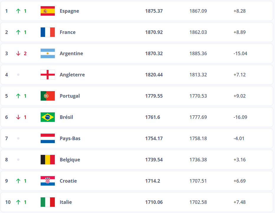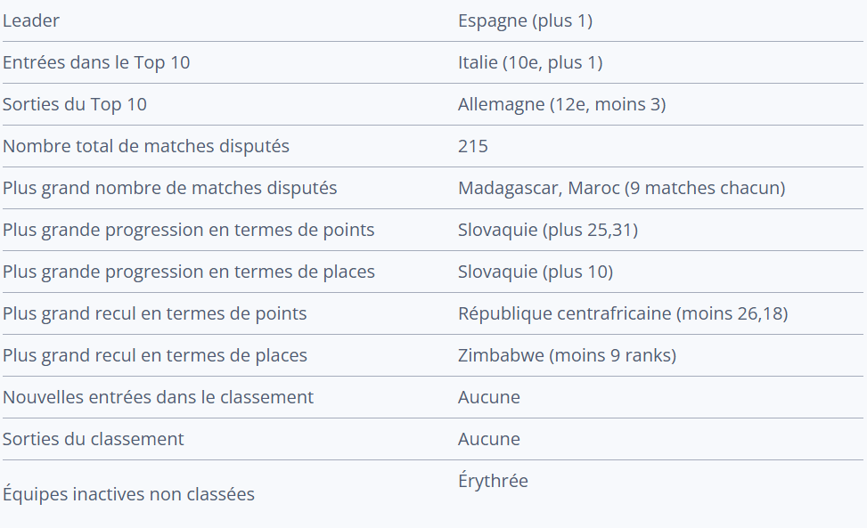L’Espagne retrouve une première place qui lui échappait depuis 2014. En tête depuis avril 2023, l’Argentine retombe au troisième rang tandis que la France est désormais deuxième. La Slovaquie signe la meilleure progression (+10 places) et s’invite dans le Top 50.