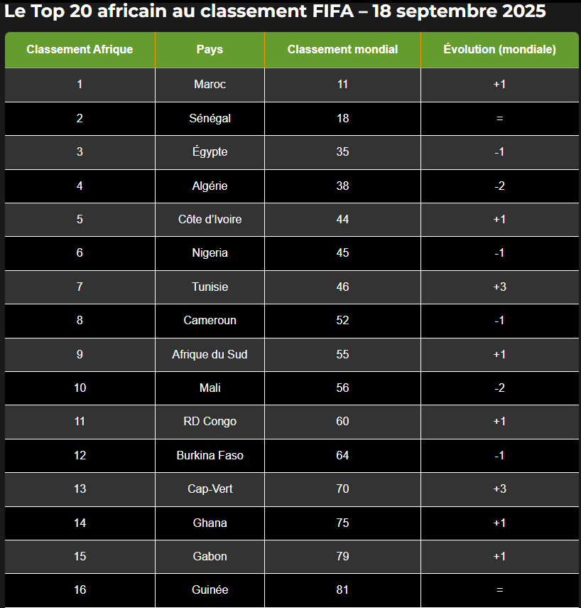 La FIFA a publié ce jeudi 18 septembre 2025 la mise à jour mensuelle de son classement mondial. Un nouveau classement marqué par des mouvements significatifs au sein des sélections africaines. En tête d’affiche, le Maroc continue son ascension fulgurante et se rapproche du Top 10 mondial, tandis que la Côte d’Ivoire crée la surprise en doublant le Nigeria. D’autres nations comme l’Ouganda, Madagascar ou la Gambie signent également de belles progressions.