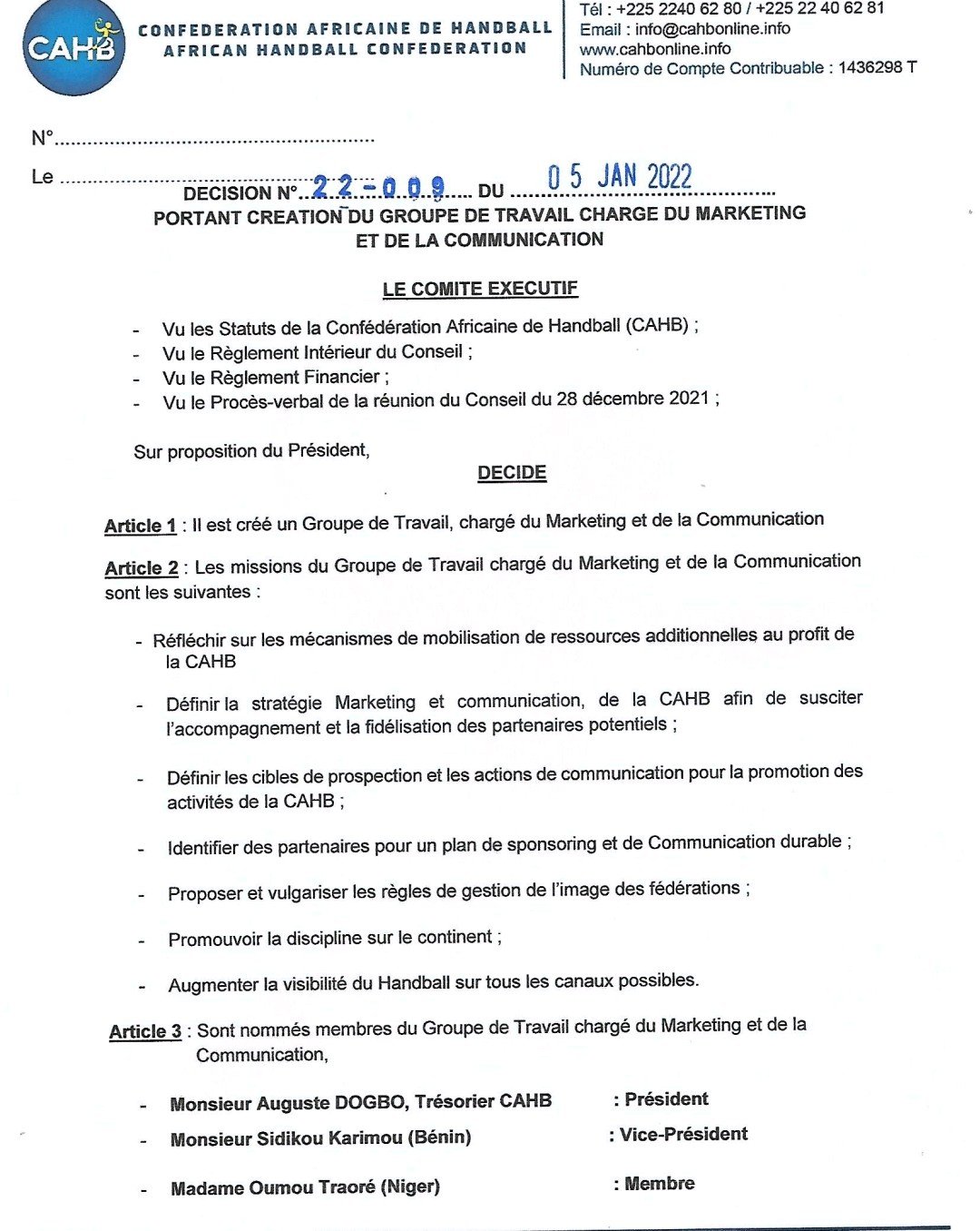 La Confédération Africaine de Handball, par le biais de son président, Docteur Arèmou Mansourou, a mis en place un Groupe de travail chargé du marketing et de la communication. A cet effet, plusieurs personnes ont été nommées pour travailler de cette nouvelle commission. Ainsi, le président de la Fédération Béninoise de Handball, Sidikou Karimou, fait partie des nominés et occupe le poste de vice-président.