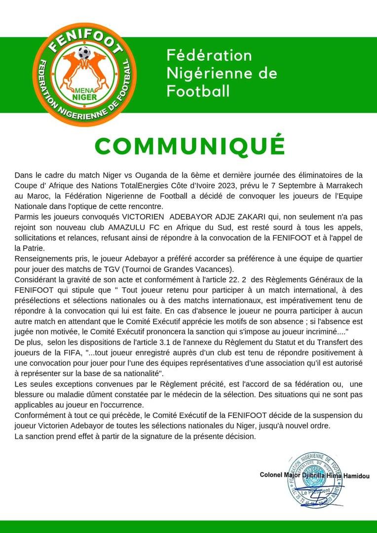 Cette décision a été mal reçue par la Fédération nigérienne de football (FENIFOOT), qui a immédiatement annoncé, dans un communiqué, la suspension d’Adebayor de toutes les sélections nationales. L’attaquant est l’un des meilleurs buteurs de l’histoire de l’équipe nationale du Niger et sa décision de ne pas répondre à la convocation a créé une controverse majeure.