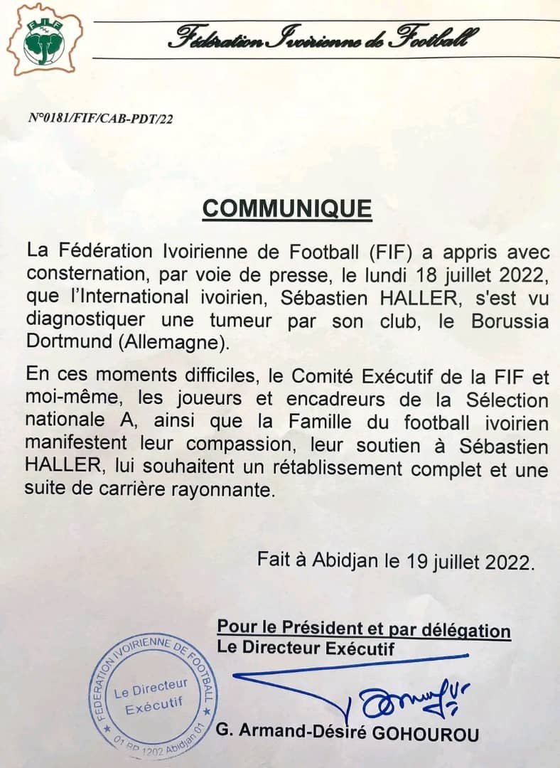 Ce lundi 18 juillet 2022, le Borussia Dortmund a annoncé qu’une tumeur testiculaire a été diagnostiqué pour son nouveau joueur, Sébastien Haller. Depuis, l’Ivoirien qui est au repos forcé a vu la foule se mettre à ses côtés dans ce moment difficile. La Fédération ivoirienne de football (FIF), n’est pas resté insensible. L’instance ivoirienne a apporté son soutien à son attaquant international ce mardi 19 juillet 2022, dans un communiqué signé par le directeur exécutif, Armand-Désiré Gohourou.