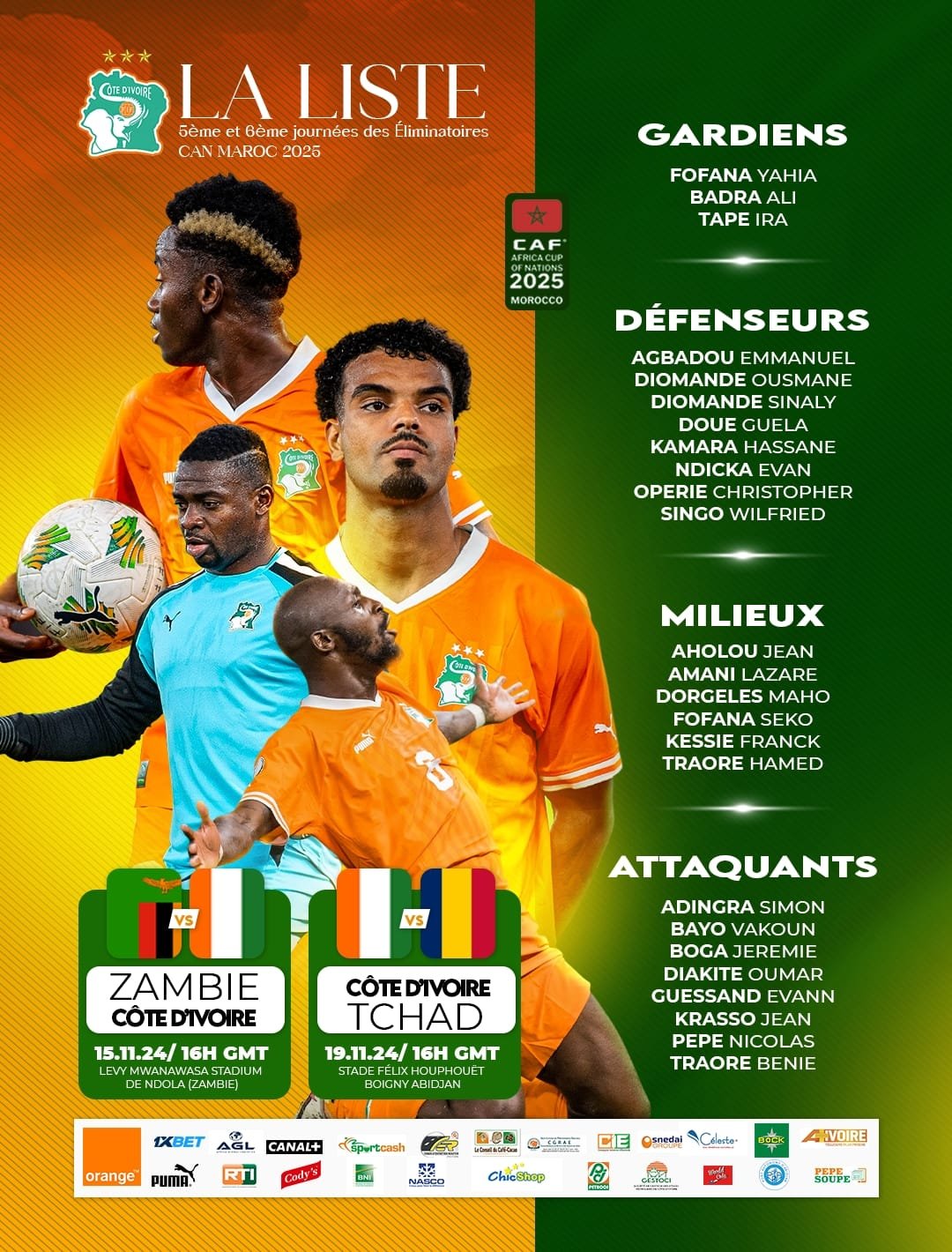 Le sélectionneur de la  Côte d’Ivoire, Emerse FAE, a dévoilé ce vendredi 08 novembre 2024, sa liste des joueurs retenus pour deux dernières journées des éliminatoires de la CAN 2025. En novembre 2024, les champions d’Afrique vont affronter la Zambie et le Tchad respectivement lors des 5ème et 6ème journée des qualifications.
