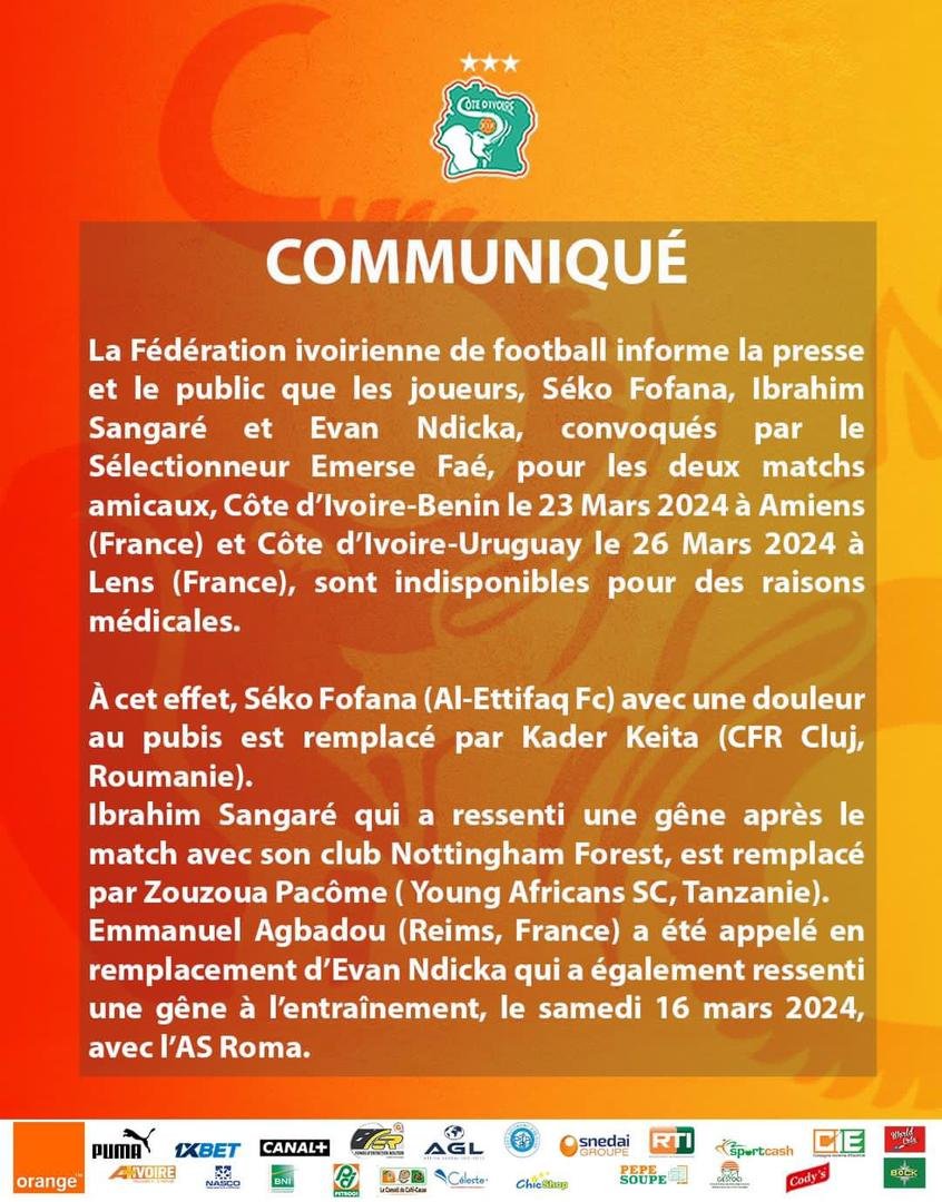 Dans un communiqué officiel, la Fédération a révélé que Séko Fofana, Ibrahim Sangaré et Evan Ndicka sont indisponibles pour les matchs à venir. Séko Fofana, évoluant à Al-Ettifaq FC, souffre d’une douleur au pubis, tandis qu’Ibrahim Sangaré, joueur de Nottingham Forest, ressent une gêne après le dernier match de son club. Enfin, Evan Ndicka, qui évolue à l’AS Roma, a également ressenti une gêne à l’entraînement.