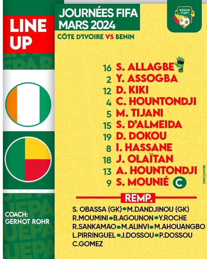 Le Bénin se mesure à la Côte d’Ivoire ce samedi 23 mars 2024 pour un rendez-vous amical des journées FIFA de mars 2024. Les Guépards, absents de la dernière CAN, vont se frotter aux champions d’Afrique en titre sans quelques éléments de leur effectif comme Olivier Verdon. Pour cette rencontre qui débute à 16H GMT, soit 17H de Cotonou, découvrez le classement concocté par le sélectionneur Gernot Rohr.