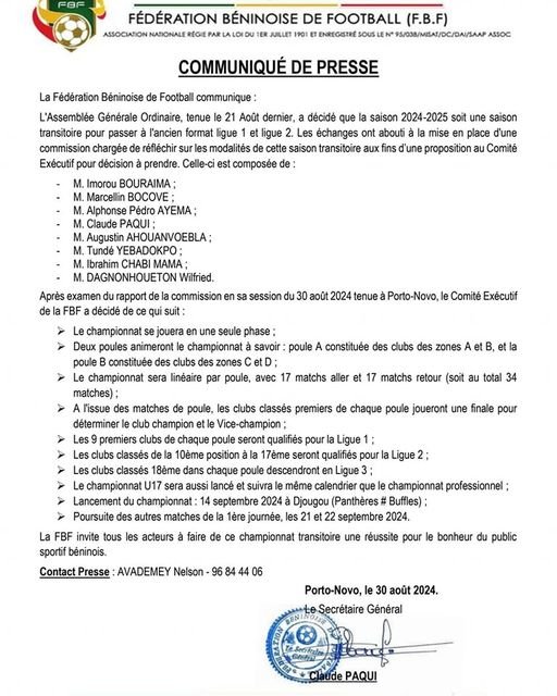 La Fédération Béninoise de Football (FBF) a publié ce samedi 31 août 2024 un communiqué officiel sur la nouvelle saison 2024-2025 qui s’annonce. L’instance a levé le voile sur les détails du déroulement de la saison 2024-2025 de football au Bénin. Cette nouvelle saison sera marquée par une transition vers l’ancien format de Ligue 1 et Ligue 2, avec pour objectif de stabiliser et de structurer les compétitions nationales.