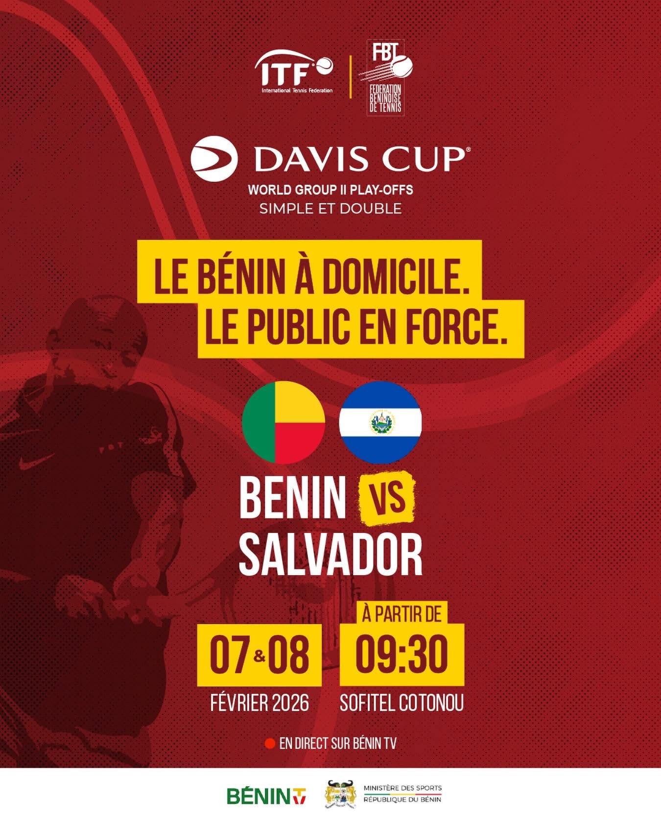 La sélection béninoise de tennis recevra le Salvador les 7 et 8 février 2026 à Cotonou dans le cadre des éliminatoires de la Coupe du monde de tennis 2026, anciennement connue sous le nom de Coupe Davis. Les rencontres se dérouleront au Sofitel Cotonou Marina Hôtel et marqueront le match aller de cette confrontation qualificative.