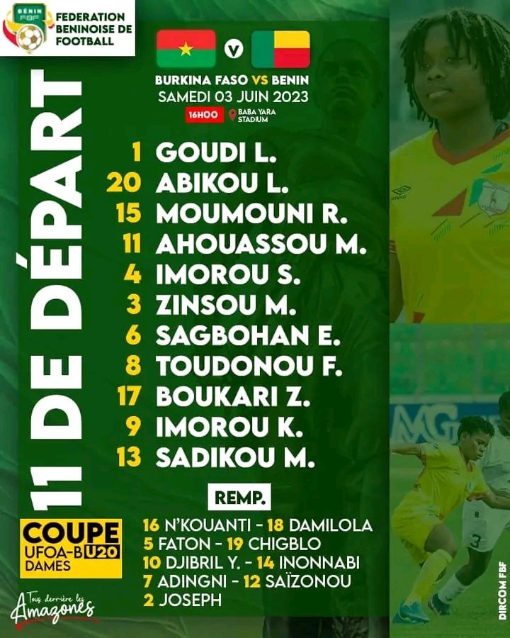 Comme prévu, les Amazones U20 du Bénin affrontent leurs homologues du Burkina-Faso pour le match pour la 3e place de la Coupe des Nations UFOA-B U20 Dames 2023. Voici le lien pour suivre le match en direct :