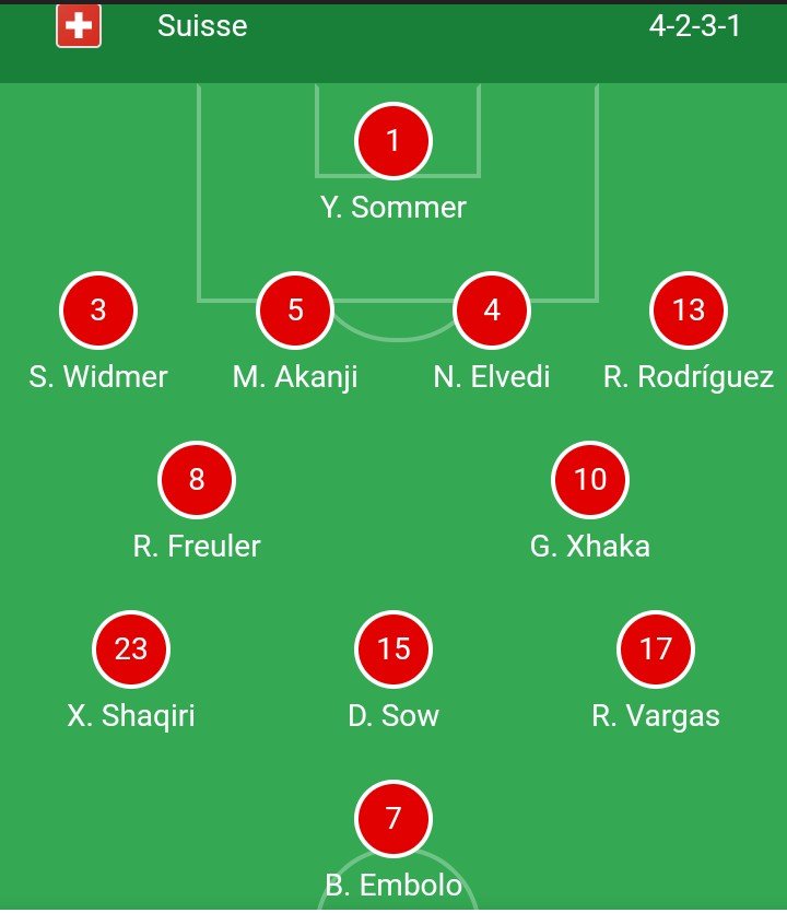 Sommer – Widmer, Akanji, Elvedi, Rodriguez – Xhaka, Freuler, Sow – Shaqiri, Embolo, Vargas.