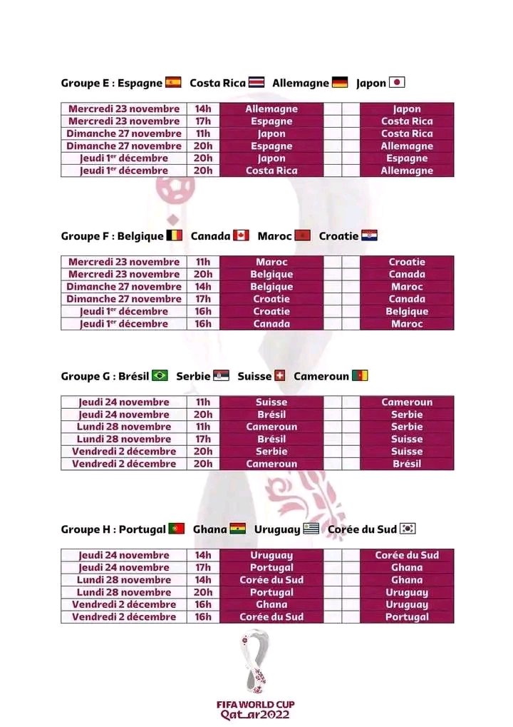 Le jour tant attendu est arrivé. Ce dimanche 20 novembre 2022, la coupe du monde 2022 prend son envol au Qatar. Un mois de compétition attend les équipes, les supporters, les téléspectateurs etc… Le match Qatar vs Equateur est l’affiche pour inaugurer la compétition. Qu’en est-il des autres matchs ? Voici le programme complet de la phase de groupe.