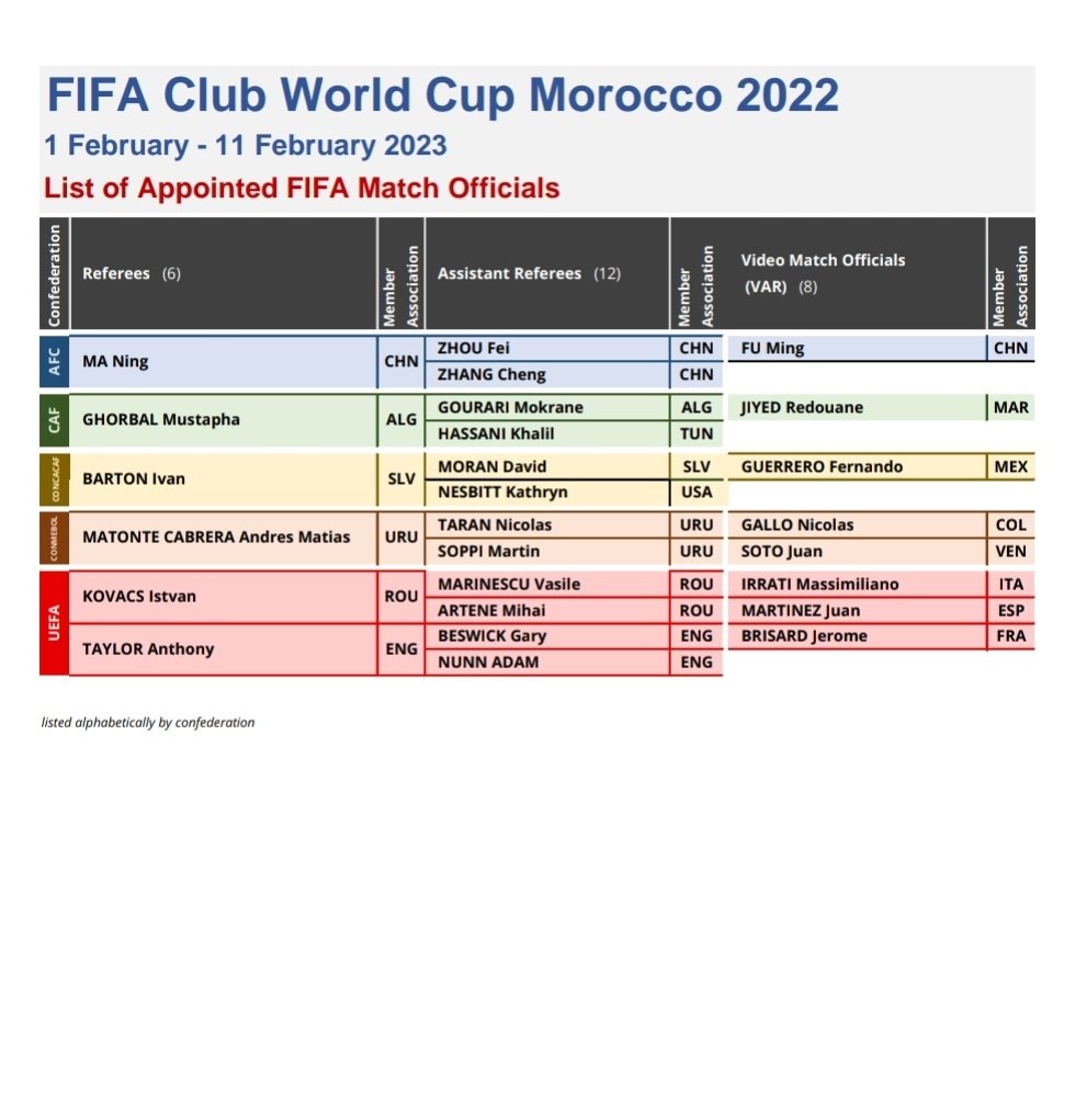 Du 1ᵉʳ au 11 février 2023, le Maroc abrite, pour la troisième fois de son histoire, la Coupe du monde des clubs de la FIFA 2022. La 19ᵉ édition de la compétition sera concernée par Al Ahly (Egypte), Auckland City (Nouvelle-Zélande), Sounders de Seattle (Etats-Unis), Wydad Casablanca (Maroc), Al Hilal (Arabie Saoudite), Flamengo (Brésil), et le Real Madrid (Espagne). La Commission des Arbitres de la FIFA a déjà dévoilé la liste des arbitres qui officieront pour le tournoi. Au total, 26 arbitres ont été sélectionnés.