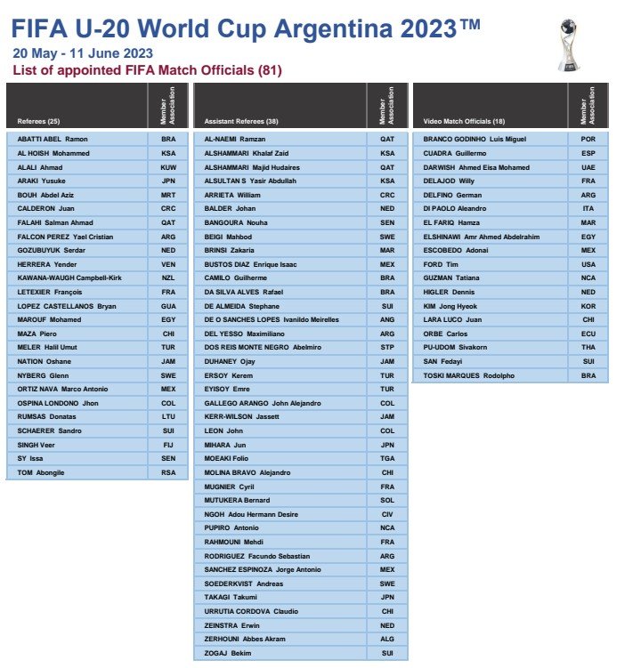 La coupe du monde U20 2023 approche à grand pas désormais. La compétition prévue du 20 mais au 11 juin 2023 en Argentine s’annonce déjà en couleur. Aux dernières nouvelles, la FIFA a rendu publique la liste des officiels de match pour le tournoi. Selon la liste, la Commission des Arbitres de la FIFA a sélectionné 25 arbitres, 38 arbitres assistants et 18 officiels de match vidéo pour la Coupe du Monde U-20 de la FIFA, Argentine 2023™. Plus de cinq arbitres africains sont sélectionnés pour prester. Aucun officiel du Bénin ne sera de la partie.