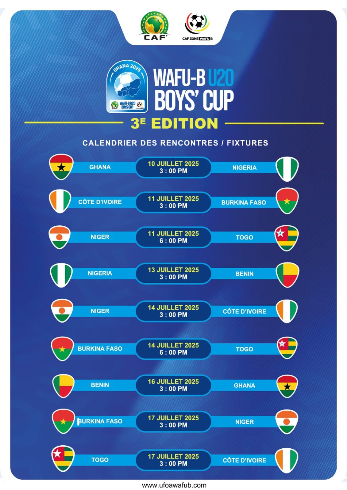 L’édition 2025 de la Coupe UFOA B U20 Garçons, prévue du 10 au 23 juillet au Ghana, entre dans sa phase décisive. Ce vendredi 20 juin, les organisateurs ont levé le voile sur le calendrier officiel de la compétition. Désormais, les huit nations participantes connaissent leur parcours dans ce tournoi qualificatif pour la Coupe d’Afrique des Nations U20.