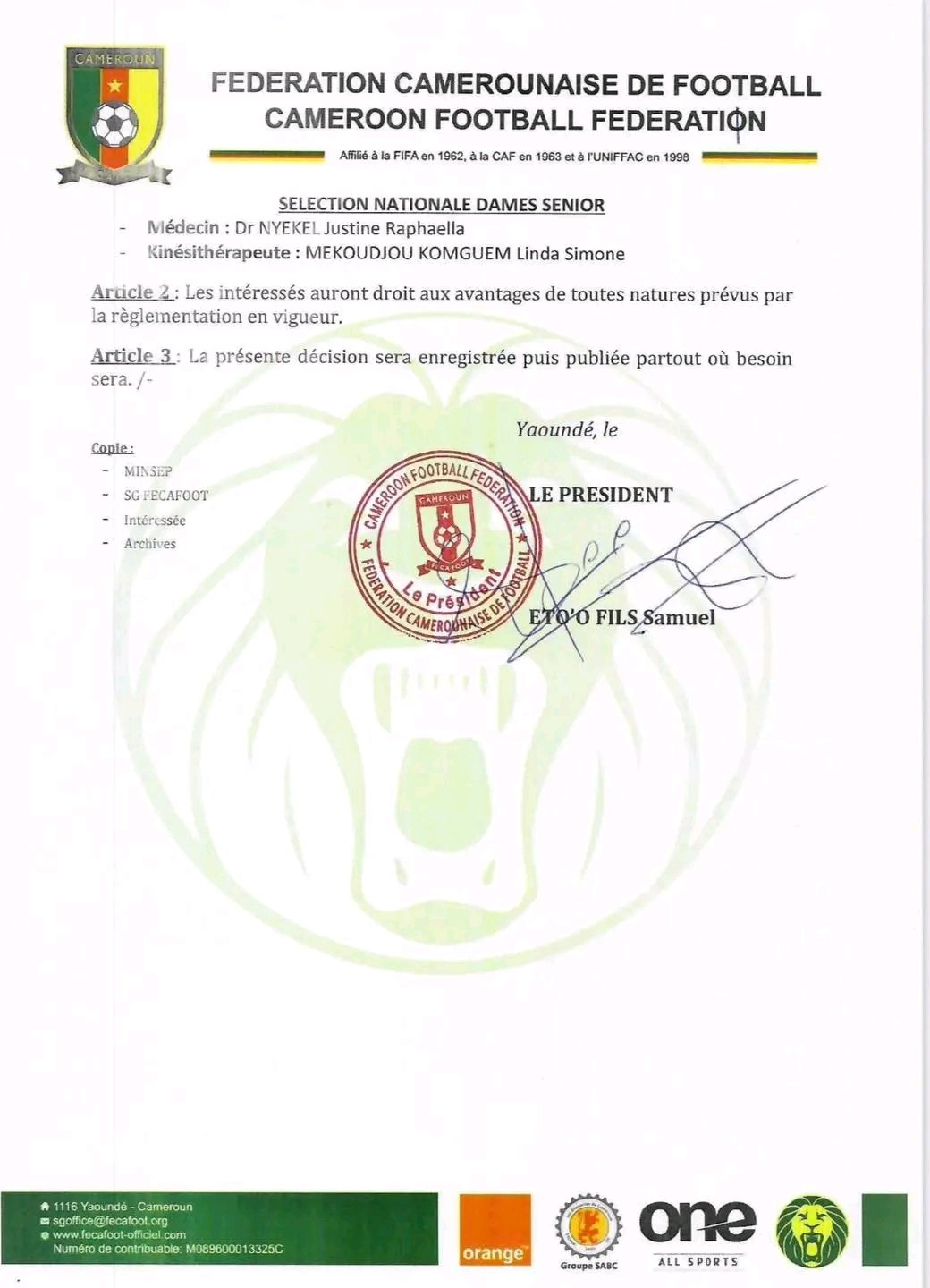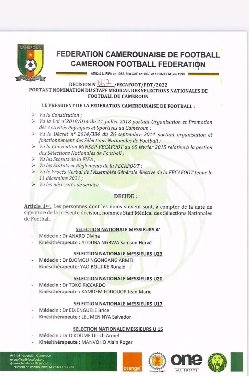 En sa qualité de président de la fédération camerounaise du football, Samuel Eto’o a procédé récemment à un réajustement en ce qui concerne le staff médical de chaque catégorie de la sélection camerounaise. Ainsi, Eto’o a nommé pour chaque catégorie de la sélection camerounaise, un médecin et un kinésithérapeute comme l’indique un communiqué rendu public par l’instance.