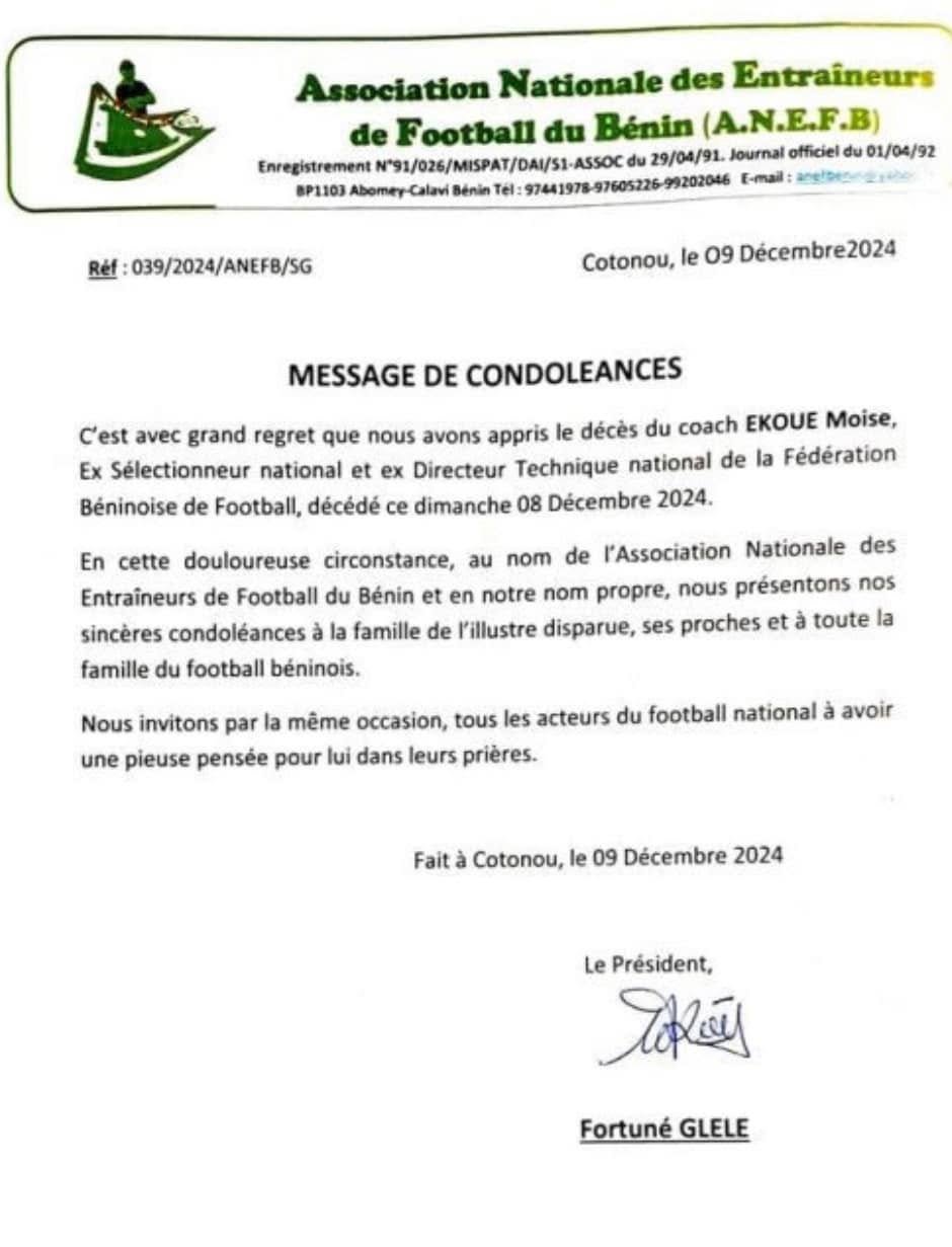 Le football béninois a récemment perdu l’une de ses figures. Ékoué Moïse, ancien sélectionneur et acteur majeur du développement du sport roi au Bénin, s’est éteint le dimanche 8 décembre 2024. La triste nouvelle a été annoncée le lundi 9 décembre par l’Association Nationale des Entraîneurs de Football du Bénin (ANEFB) dans une note officielle.