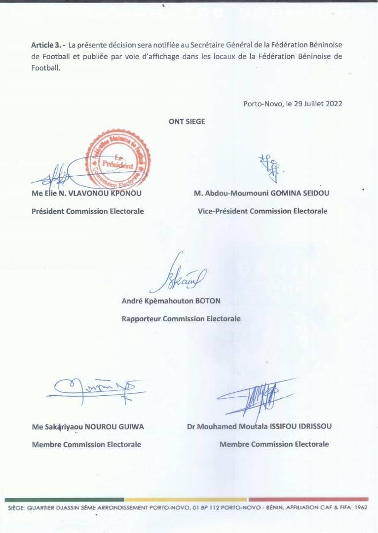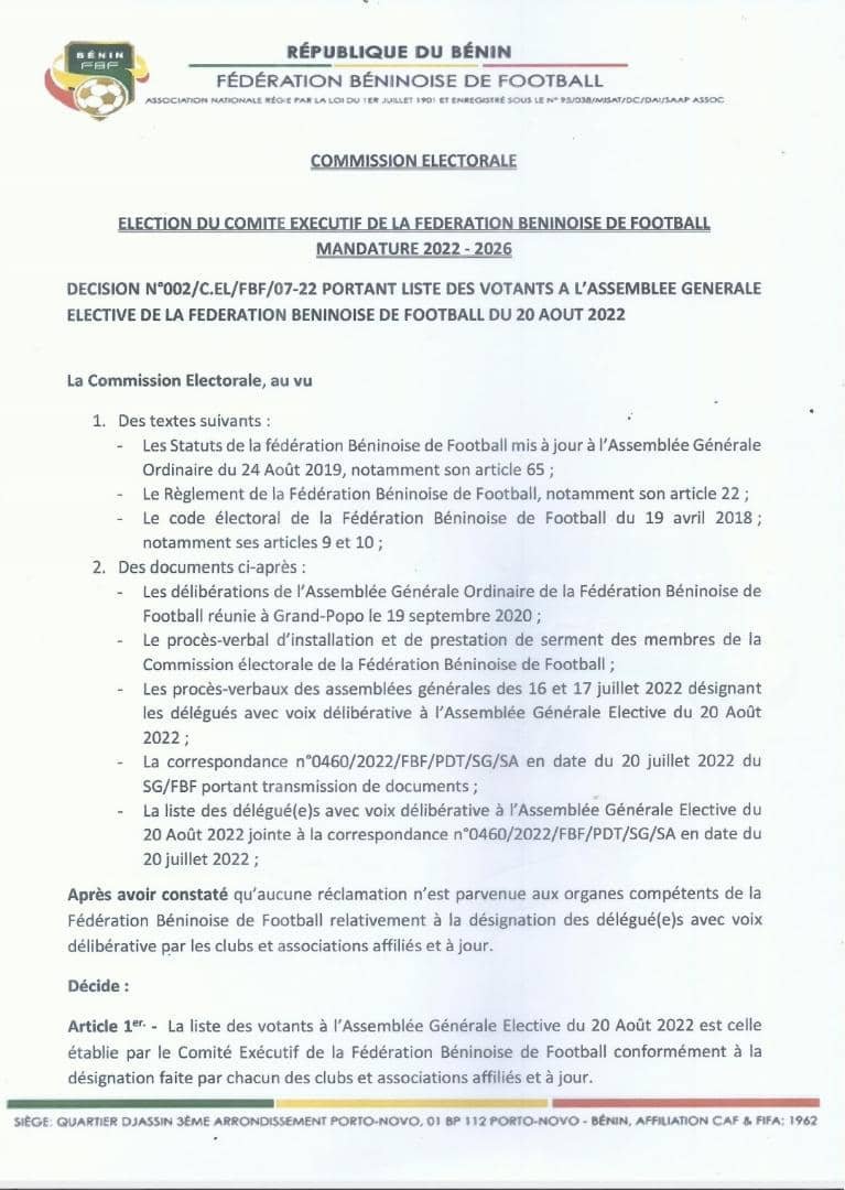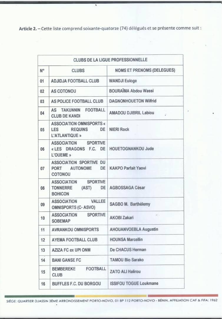 De plus en plus, tout se dessine, se précise, se confirme et s’affirme pour une continuité de la gestion du président Mathurin de-Chacus à la Fédération Béninoise de Football. Plus rien n’arrête le président Mathurin de-Chacus qui porte la liste “ALLONS PLUS LOIN”. En effet, Mathurin de-Chacus a le champ libre pour rempiler. Candidat à sa propre succession, il sera réélu haut les mains le 20 Août 2022. C’est une évidence. Plus de doute d’ailleurs autour. L’identité des délégués (liste ci-dessous) ayant droit de vote est connue, les regards sont tournés vers l’assemblée générale élective proprement dite.