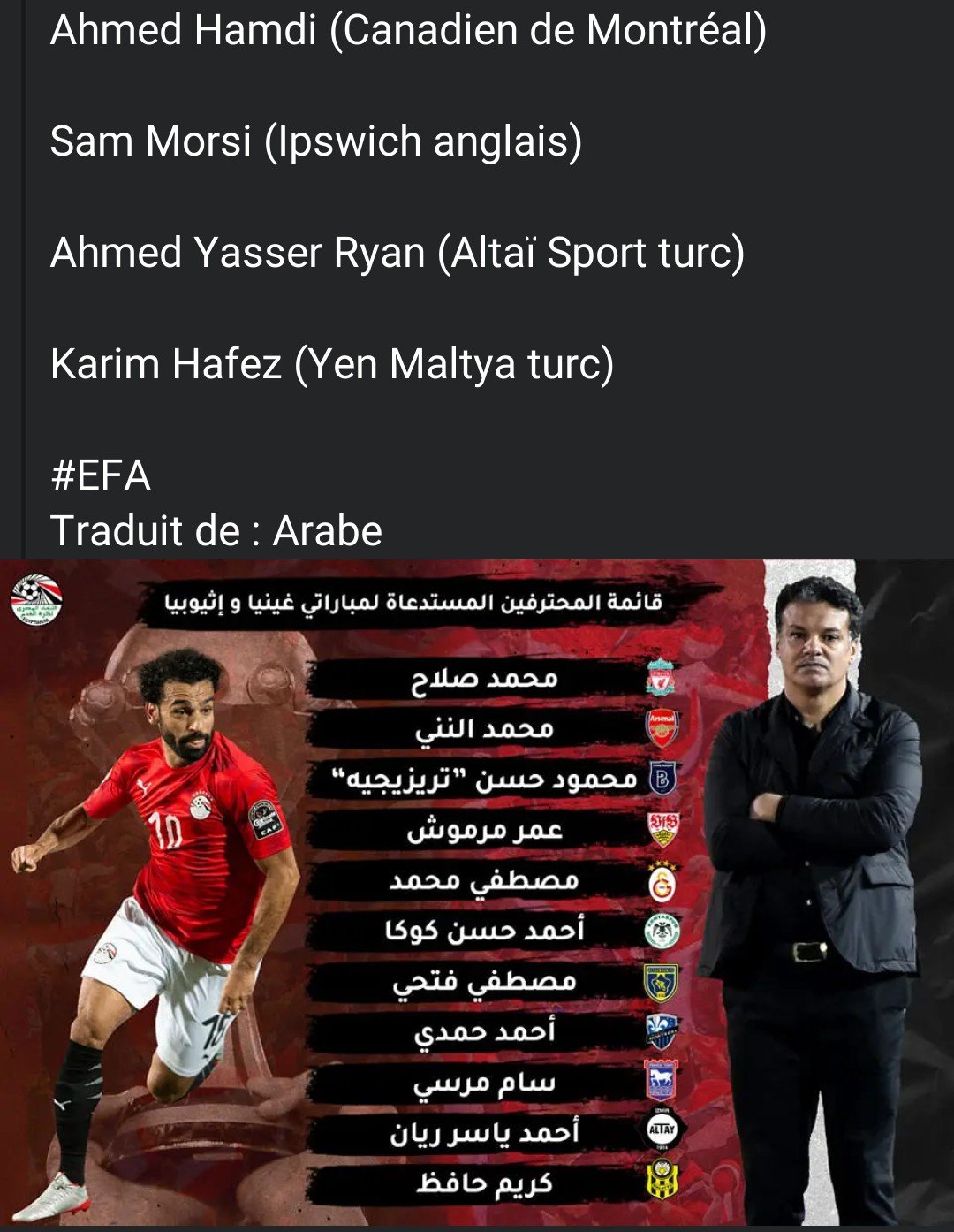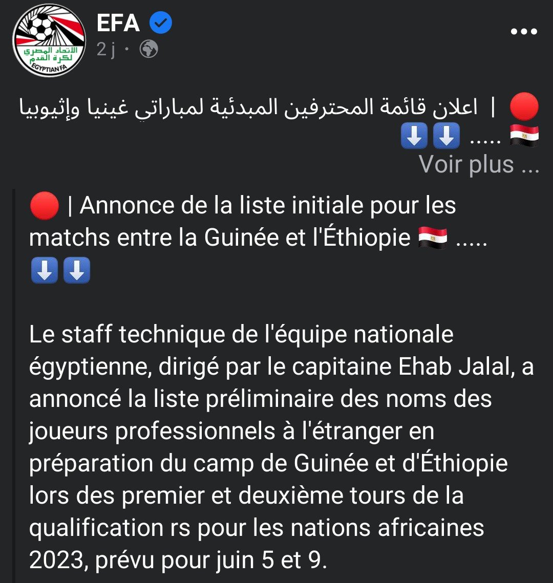 Bien qu’il soit actuellement loin des terrains à cause d’une blessure, Mohamed Salah est bien présent dans la liste de 12 expatriés révélée par le nouveau sélectionneur de l’Égypte, Ehab Galal, pour affronter la Guinée (2 juin 2022) puis l’Ethiopie (6 juin 2022) à l’occasion des deux premières journées des éliminatoires de la CAN 2023. L’information a été révélée par la fédération égyptienne de football à travers une publication sur les réseaux sociaux.