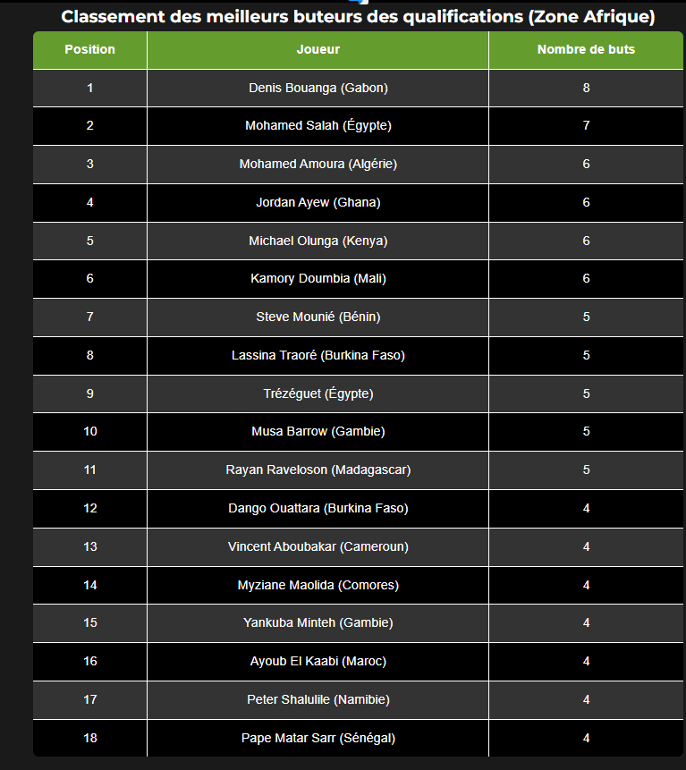 Les qualifications africaines pour la Coupe du monde 2026 entrent dans leur phase décisive. Après huit journées sur dix, le Gabonais Denis Bouanga occupe la tête du classement des meilleurs buteurs avec 8 réalisations, devant l’Égyptien Mohamed Salah (7 buts) et un quatuor d’attaquants africains à 6 buts chacun. Le Guépards du Bénin, n’est pas loin dans la course au titre de meilleur buteur des qualifications africaines.