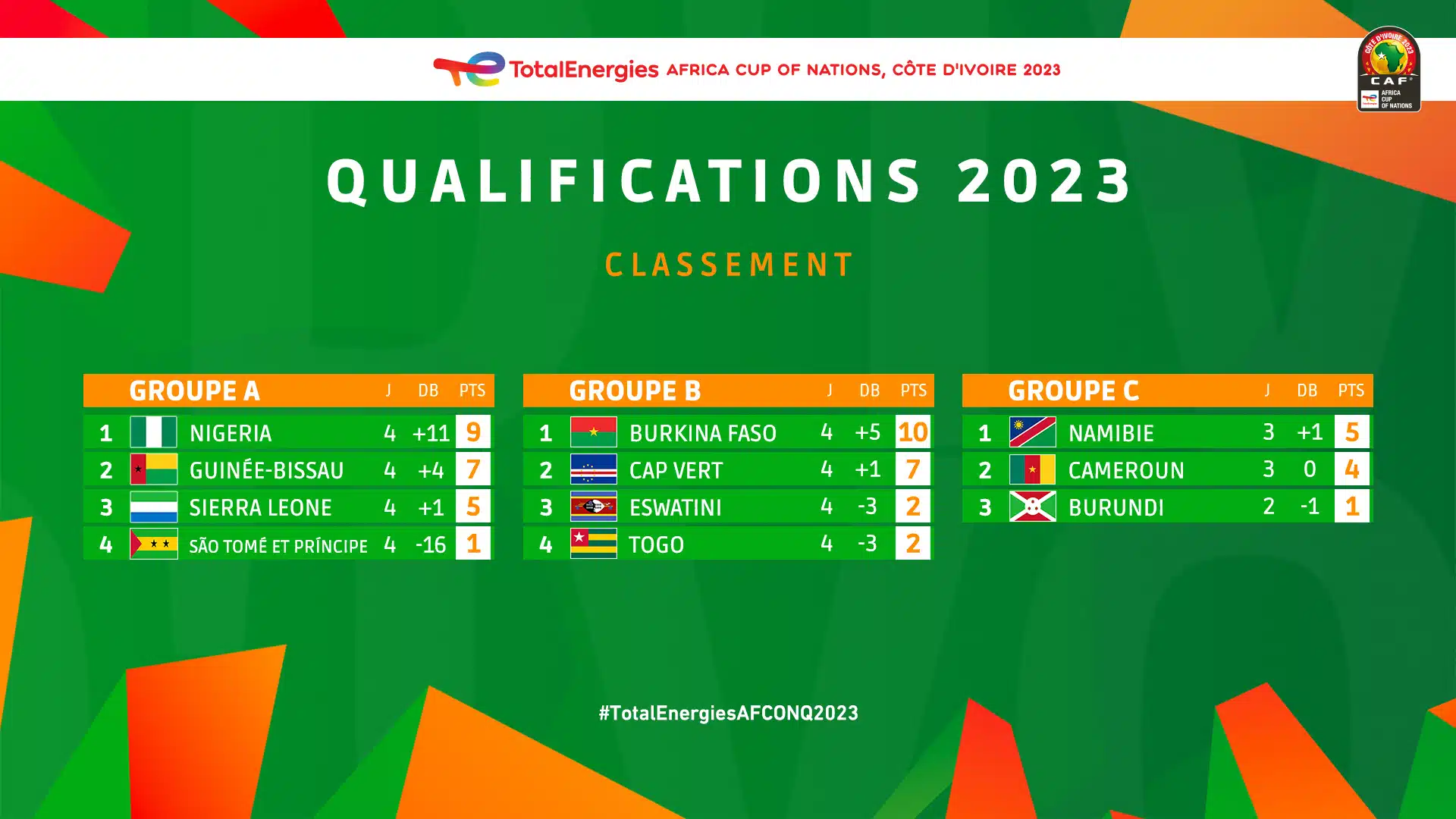 Actuel leader du groupe B avec 10 points, le Burkina Faso est déjà qualifié. Le Cap-Vert, 2ᵉ avec 7 points, n’est pas aussi loin de décrocher sa qualification. Le cas de l’Eswatini et le Togo, 2 points chacun, est très compliqué.