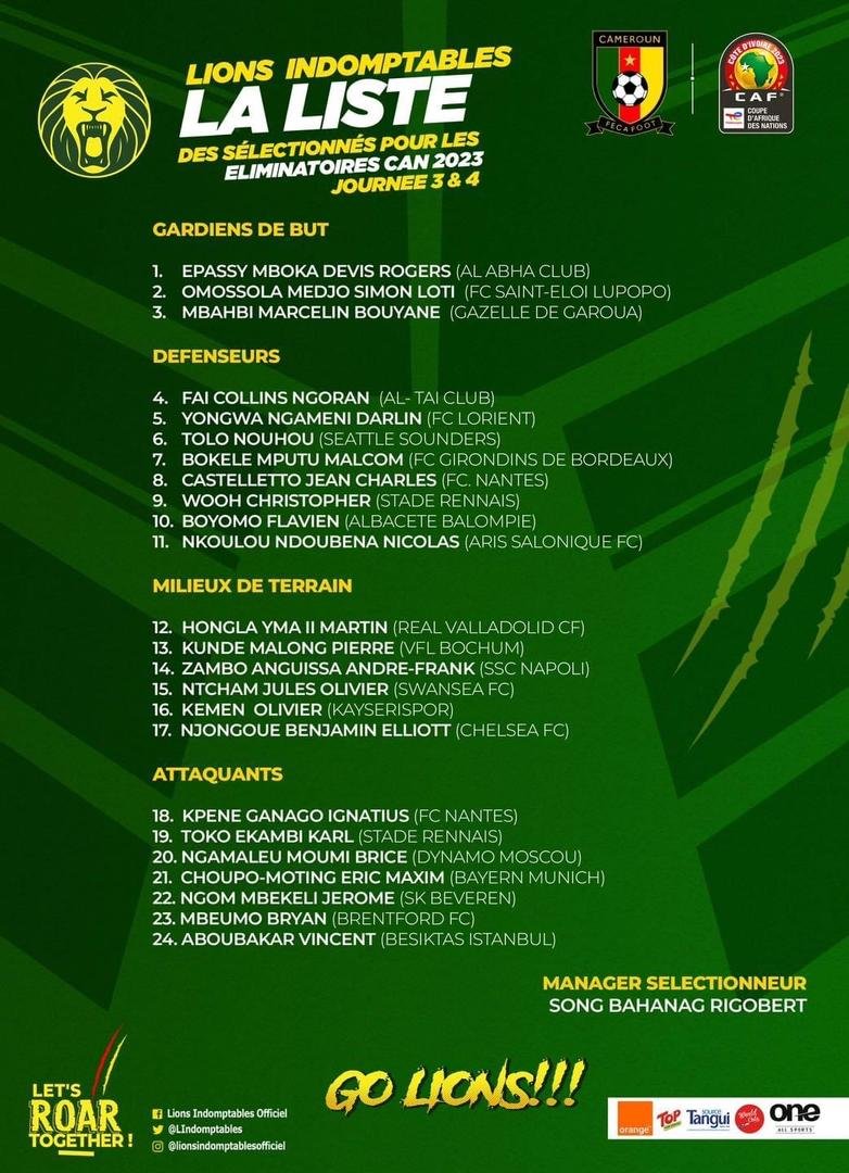Eliminatoires CAN 2023 : La liste du Cameroun pour le rassemblement de Mars 2023