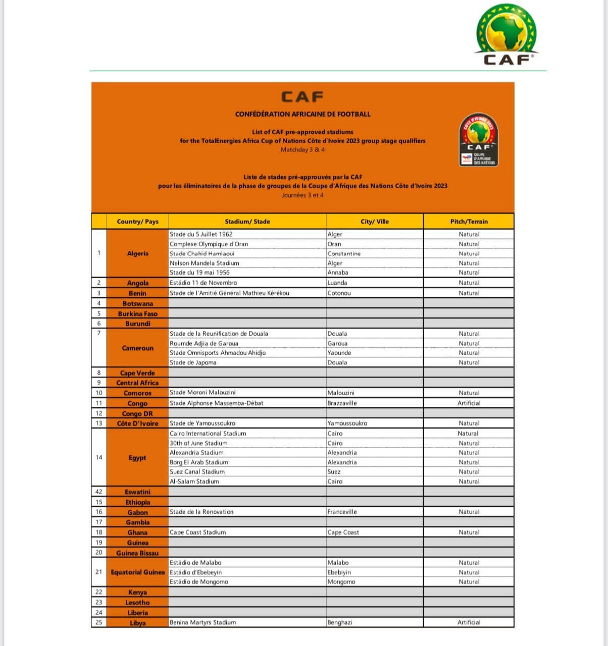 Après plusieurs mois de pause, les éliminatoires de la CAN 2023 vont reprendre très bientôt avec les 3e et 4e journées. Initialement prévues pour les 19 et 27 septembre 2022, ces deux journées des éliminatoires ont été reprogrammées pour les 20 et 28 mars 2023. À quelques jours des rencontres, la CAF a rendu public la liste officielle des stades approuvés par pays dans une note circulaire. Le stade Général Mathieu Kérékou du Bénin a été retenu par l’instance.