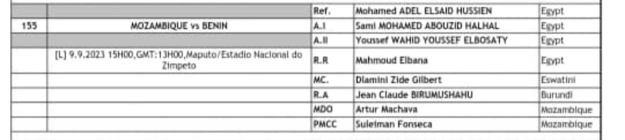 Le choc de la dernière journée des éliminatoires de la CAN 2023 dans le groupe L entre le Mozambique et le Bénin sera dirigé par un quatuor d’arbitres égyptiens. Voici l’identité de tous les officiels qui seront en charge de ce match décisif, prévu pour le 9 septembre 2023 à 15h00 GMT au stade Maputo/Estadio Nacional do Zimpeto :