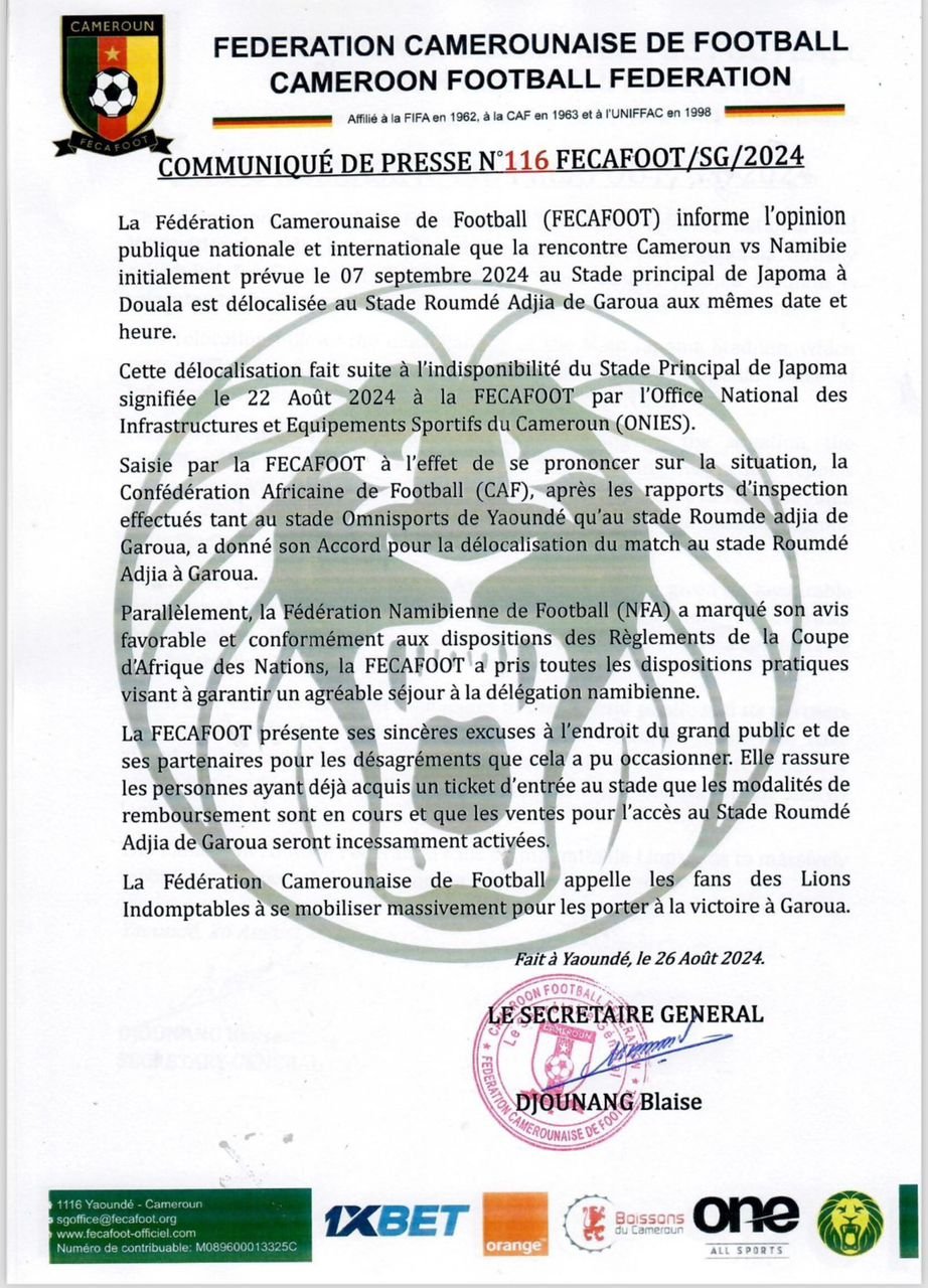 Ce lundi 26 août 2024, la Fédération Camerounaise de Football (FECAFOOT) a annoncé un changement de lieu pour la rencontre entre le Cameroun et la Namibie, initialement prévue au Stade principal de Japoma à Douala. En raison de l’indisponibilité de ce stade, signalée par l’Office National des Infrastructures et Equipements Sportifs du Cameroun (ONIES) le 22 août 2024, le match du 7 septembre 2024 se tiendra finalement au Stade Roumdé Adjia de Garoua, à la même date et heure.