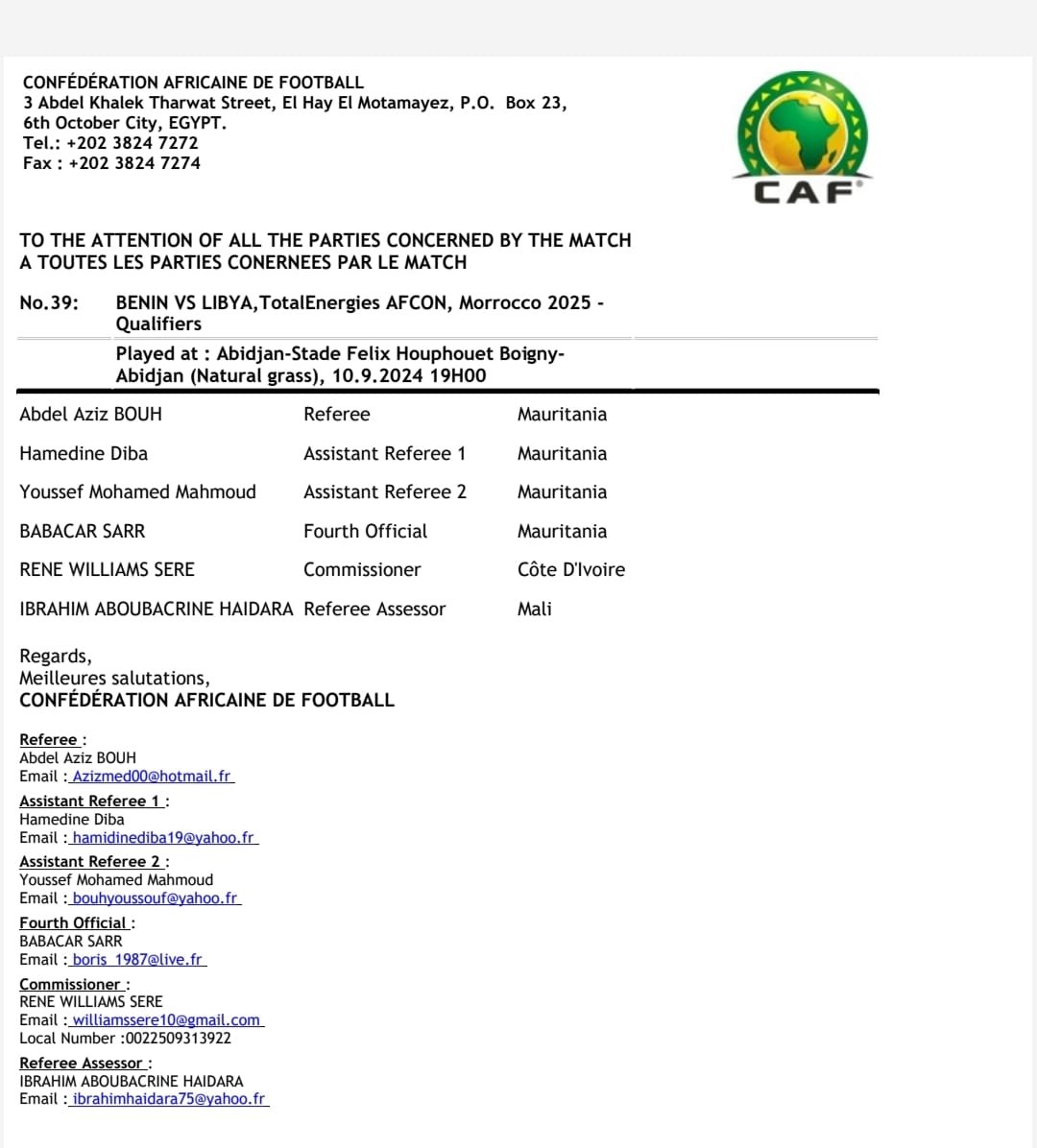 La Confédération Africaine de Football (CAF) a désigné les arbitres pour la rencontre entre le Bénin et la Libye de la deuxième journée des éliminatoires de la CAN Maroc 2025. Le match, qui se déroulera le 10 septembre 2024 au stade Félix Houphouët-Boigny d’Abidjan, sera dirigé par un quatuor mauritanien.