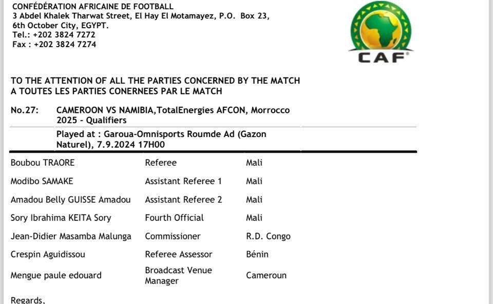 Éliminatoires CAN 2025 : Un béninois désigné sur Cameroun vs Namibie de la première journée