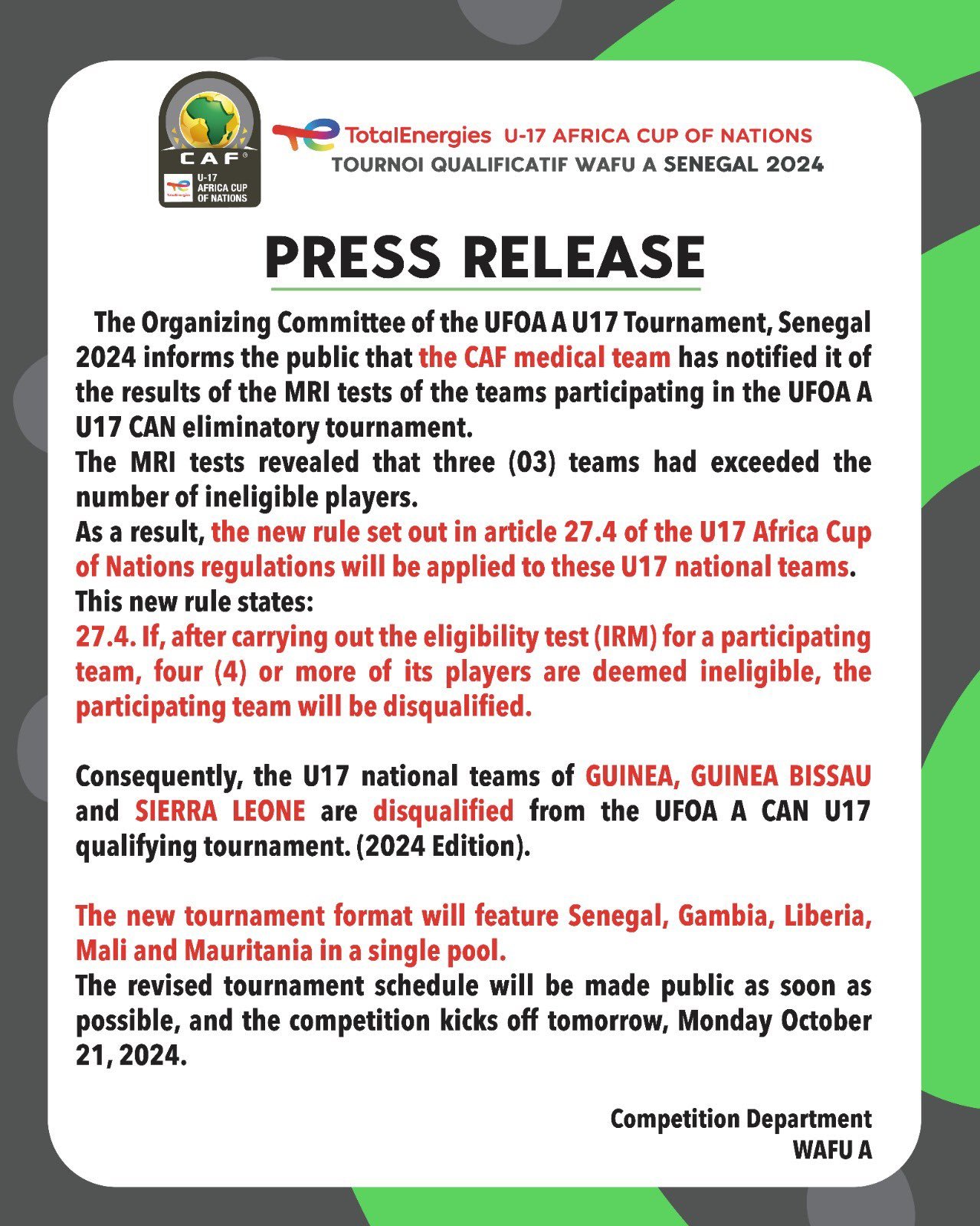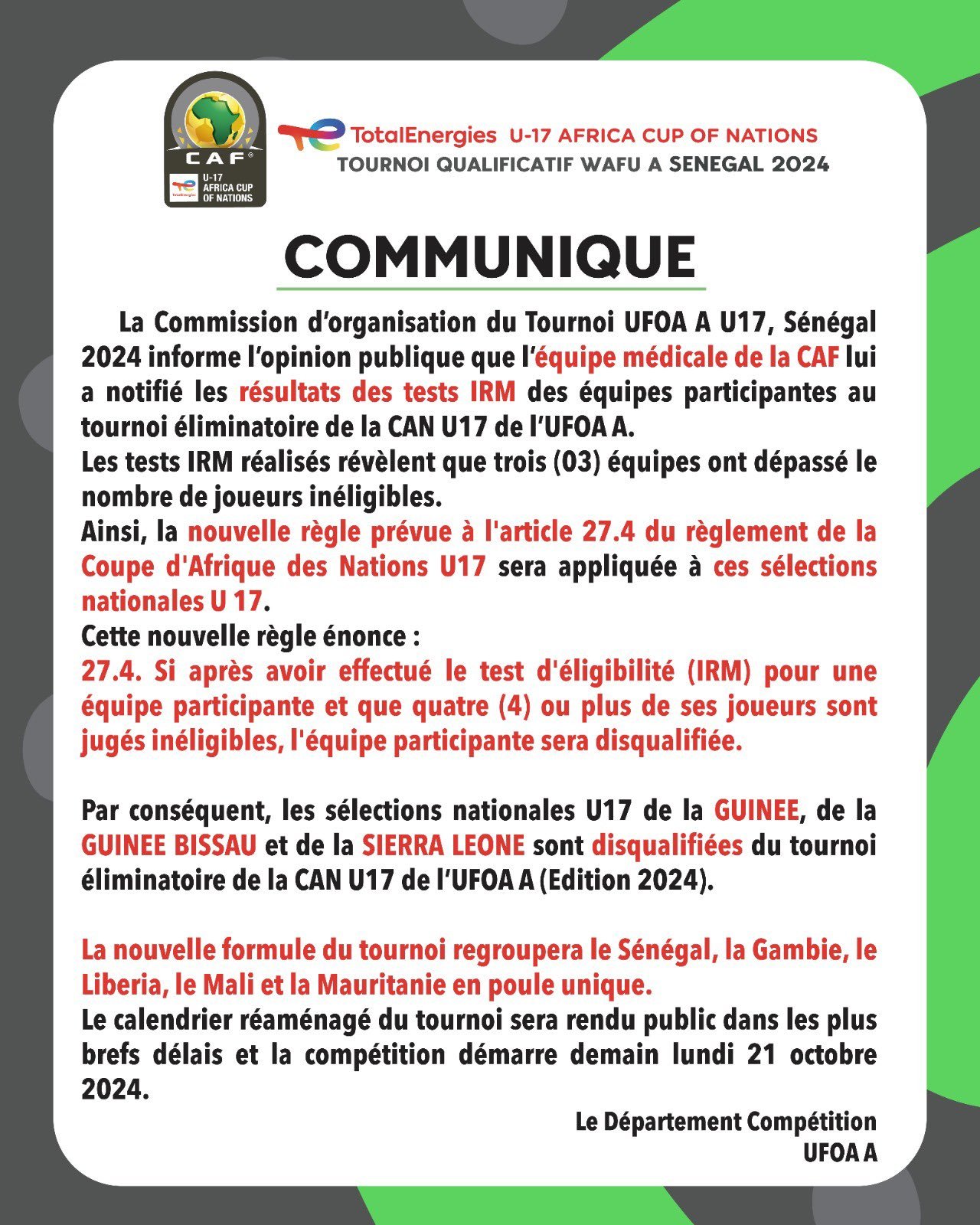 Juste avant le coup d’envoi des éliminatoires de la CAN U17 en zone Afrique de l’Ouest A, trois équipes ont été disqualifiées par la Confédération africaine de football (CAF) pour fraude sur l’âge. La Guinée, la Guinée-Bissau et la Sierra Leone ont été recalées après les tests préliminaires d’Imagerie par Résonance Magnétique (IRM), qui ont révélé que plusieurs de leurs joueurs étaient jugés inéligibles. En conséquence, le tournoi éliminatoire se déroulera désormais avec cinq équipes : le Sénégal, la Gambie, le Liberia, le Mali et la Mauritanie. Ces équipes s’affronteront dans une poule unique pour se qualifier à la prochaine CAN U17.