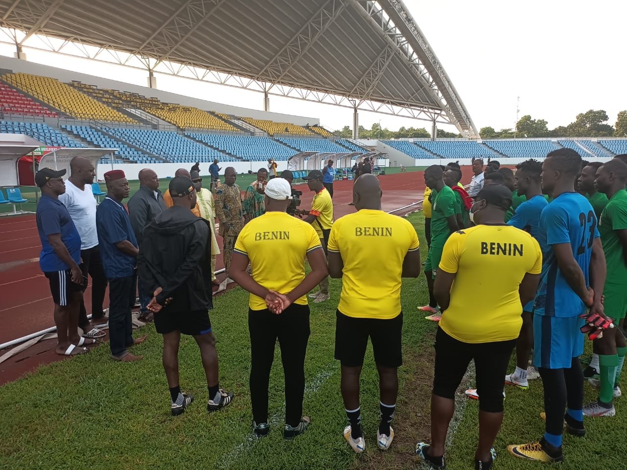 C’est déjà ce dimanche 24 juillet 2022 que les Écureuils A’ jouent les Blacks Stars locaux. Traditionnelle reconnaissance de terrain la veille dans l’après-midi, la troupe a reçu la visite d’une forte délégation de l’exécutif de la fédération béninoise conduite par Radji Soumanou.