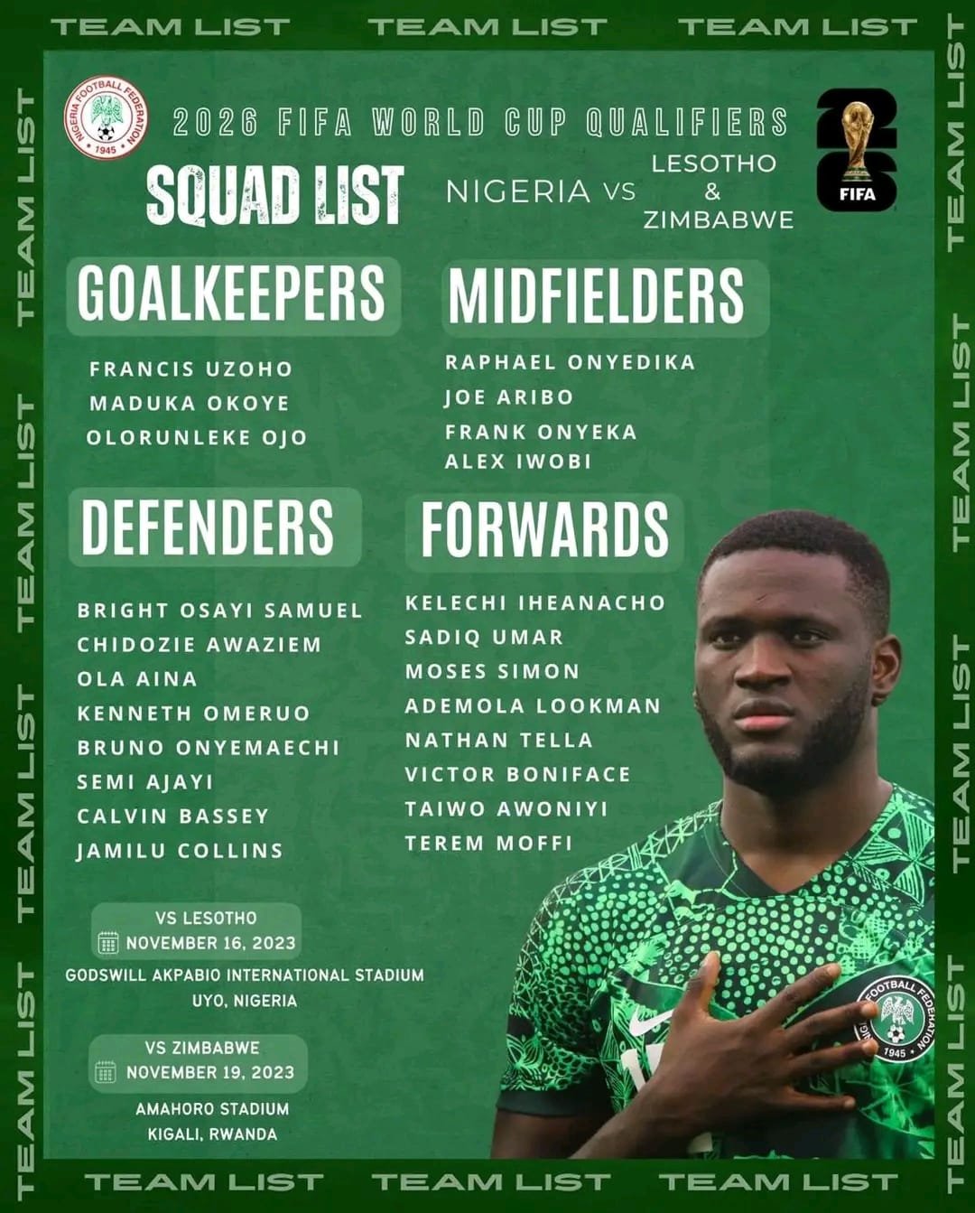 Le sélectionneur des Super Eagles, José Peseiro, a révélé la liste des joueurs qui représenteront le Nigeria lors des deux premières journées des éliminatoires de la Coupe du Monde 2026. Les Super Eagles affronteront le Lesotho et le Mozambique au cours de la trêve internationale de novembre 2023. Cependant, la liste est marquée par deux absences notables, celles de Victor Osimhen et Samuel Chukwueze.