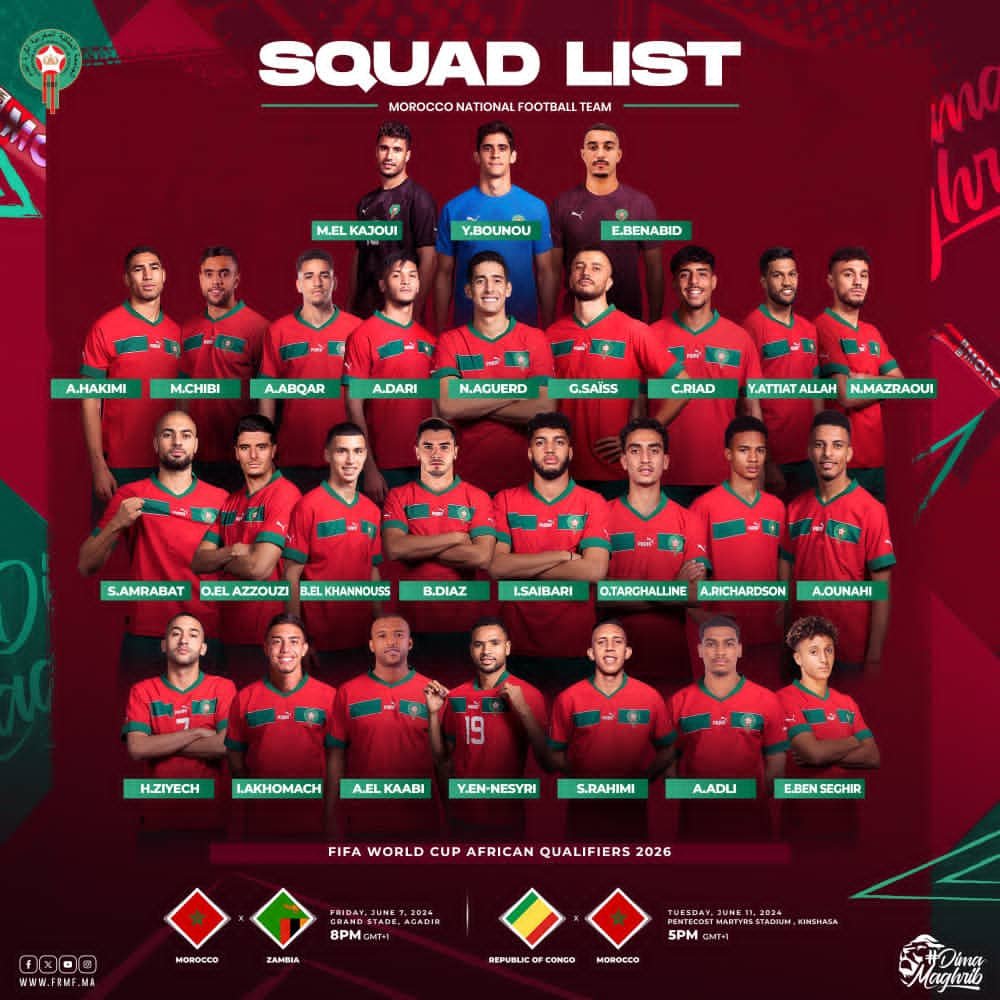 Ce mardi 28 mai 2024, le sélectionneur des Lions de l’Atlas, Walid Regragui, a annoncé sa liste des joueurs convoqués pour les deux matchs de juin 2024. Deux rencontres qui verront les Lions de l’Atlas affronter la Zambie le 6 juin 2024 avant de se mesurer à la République du Congo 9 juin 2024.
