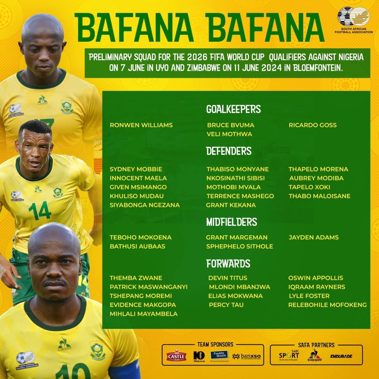 Hugo Broos a publié la première liste des joueurs retenus pour la reprise des éliminatoires du mondial 2026 en juin 2024. Les Bafana Bafana disputeront deux matchs contre le Nigeria et le Zimbawe dans le cadre des 3ᵉ et 4ᵉ journées des éliminatoires du tournoi mondial de 2026. Le sélectionneur de l’équipe nationale d’Afrique du Sud a déjà dévoilé sa préliste pour ces rendez-vous.
