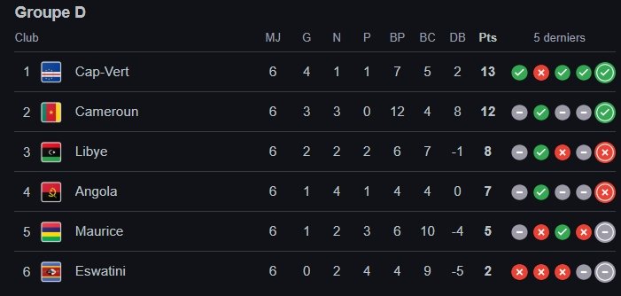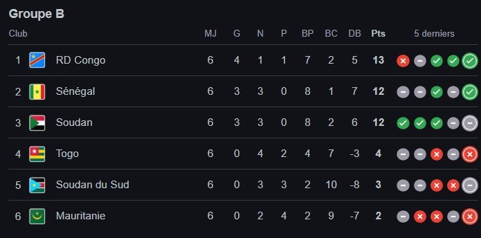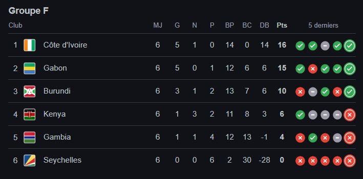 Classement de chaque groupe après la 6ème journée