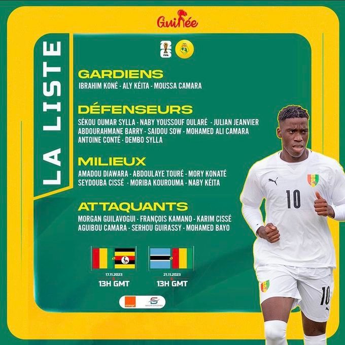 La liste du sélectionneur du Syli National de Guinée, Kaba Diawara, pour les deux premières journées des éliminatoires de la coupe du monde 2026 est désormais connue. Ce mardi 07 novembre 2023, une liste de 23 joueurs a été dévoilée pour les matchs contre l’Ouganda (le 17 novembre à Berkane au Maroc) et le Botswana (le 21 novembre à Francistown).