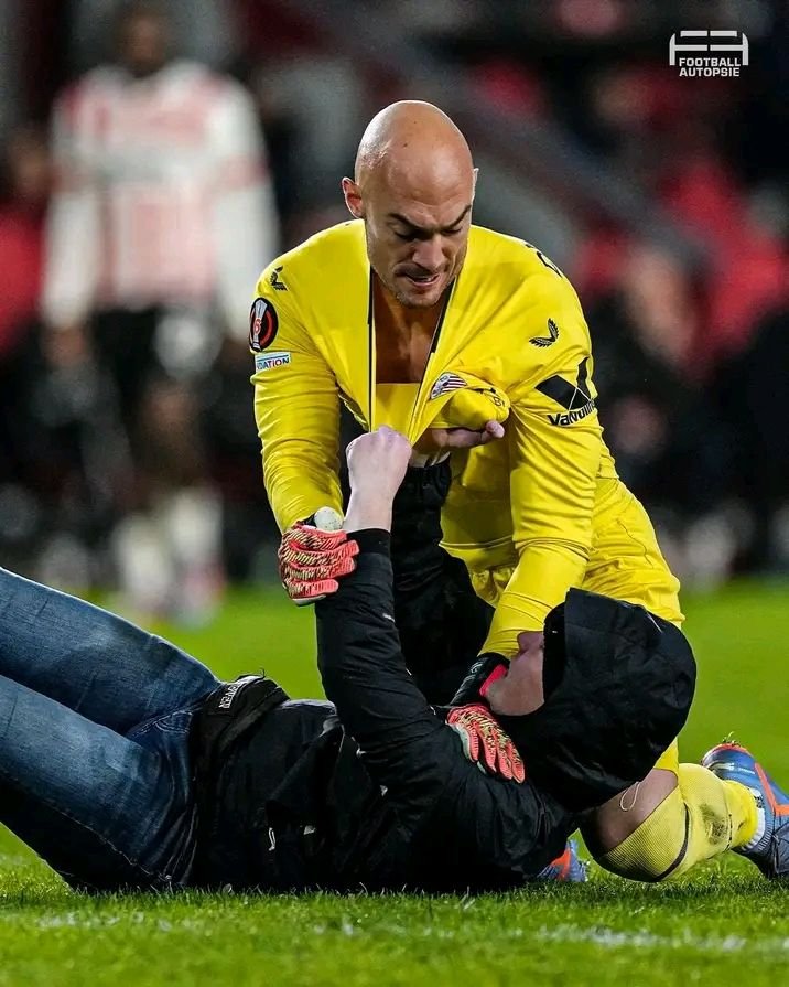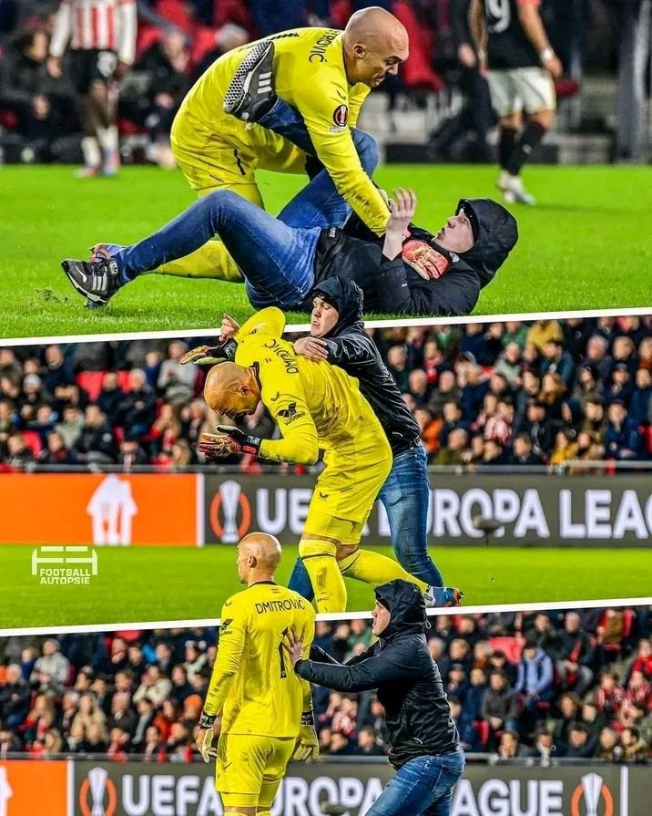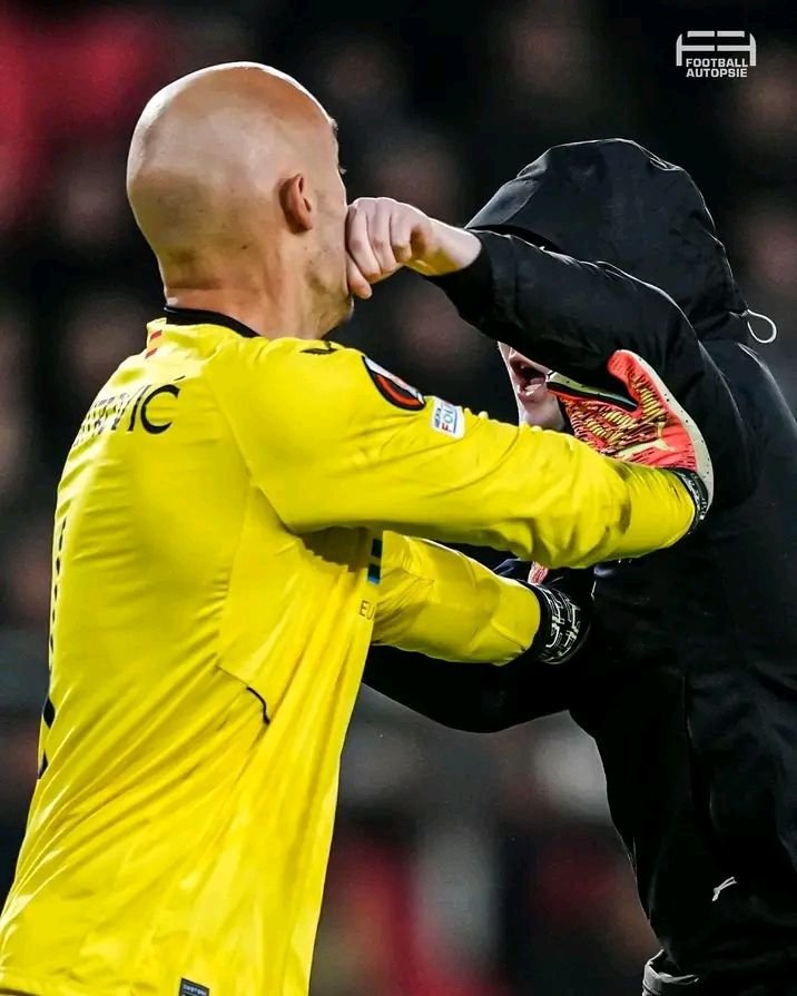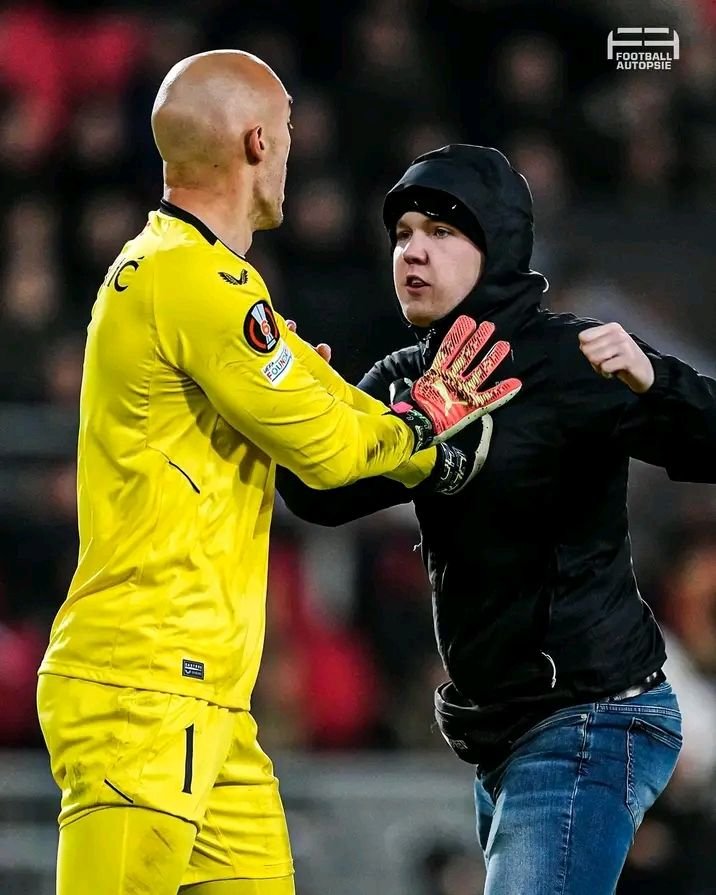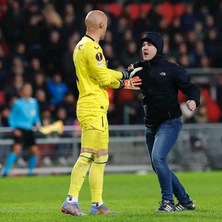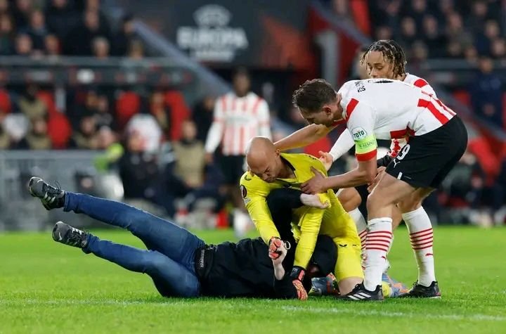 Le match de Ligue Europa entre le PSV et Séville, ce jeudi 23 février 2023, a brièvement basculé dans le chaos lorsqu’un fan a couru sur le terrain et a frappé le gardien de but de Séville au visage. Ce fan du PSV a envahi le terrain pour attaquer le gardien de Séville Dmitrovic, qui a riposté et l’a envoyé au sol jusqu’à l’arrivée des stewards.