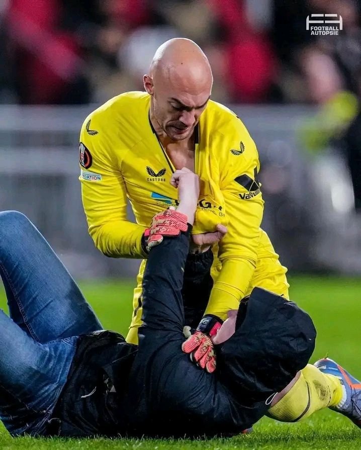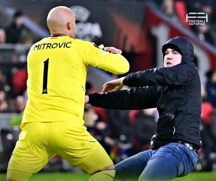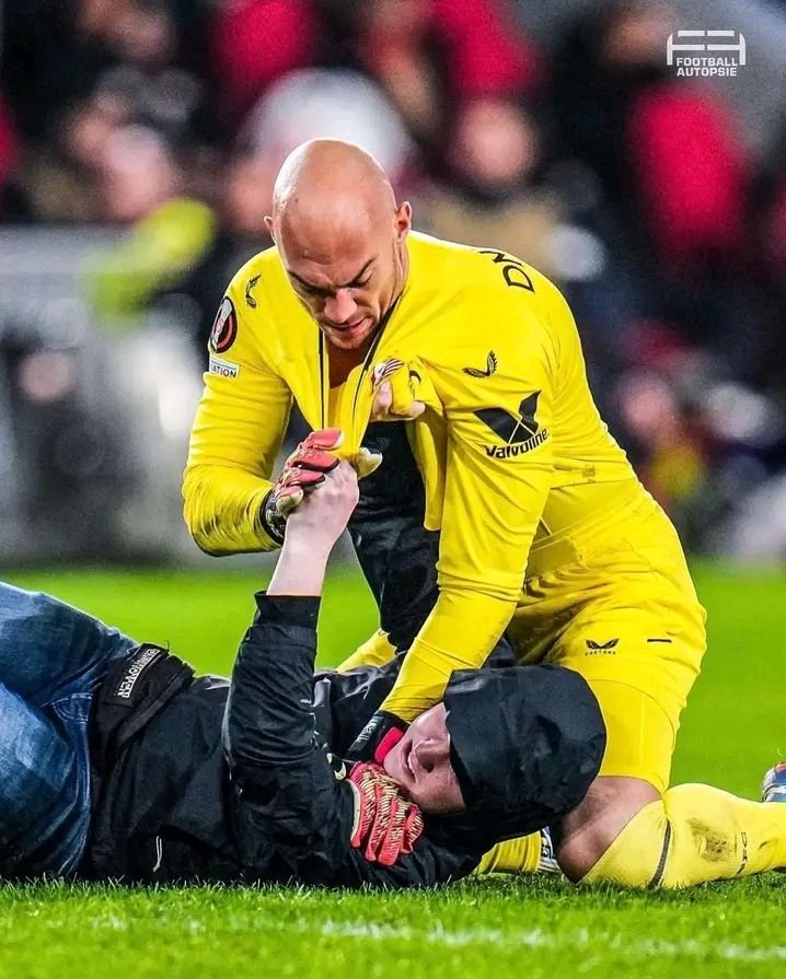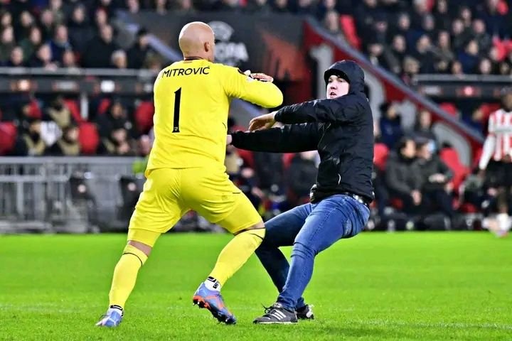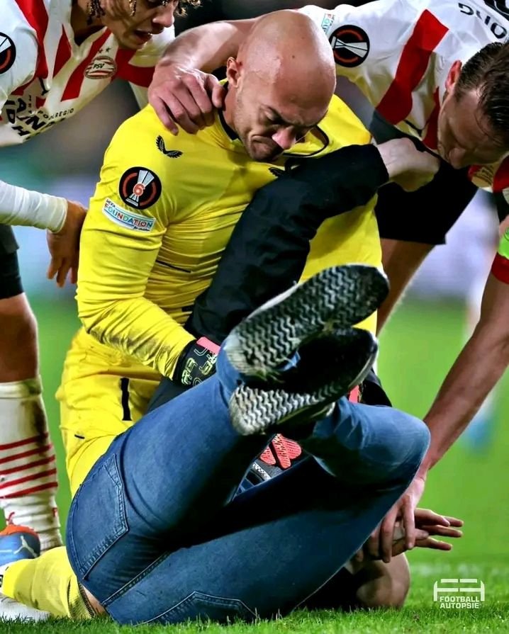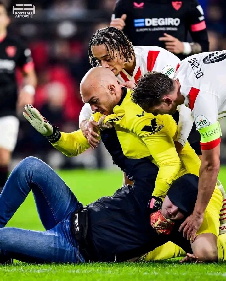 Le match de Ligue Europa entre le PSV et Séville, ce jeudi 23 février 2023, a brièvement basculé dans le chaos lorsqu’un fan a couru sur le terrain et a frappé le gardien de but de Séville au visage. Ce fan du PSV a envahi le terrain pour attaquer le gardien de Séville Dmitrovic, qui a riposté et l’a envoyé au sol jusqu’à l’arrivée des stewards.