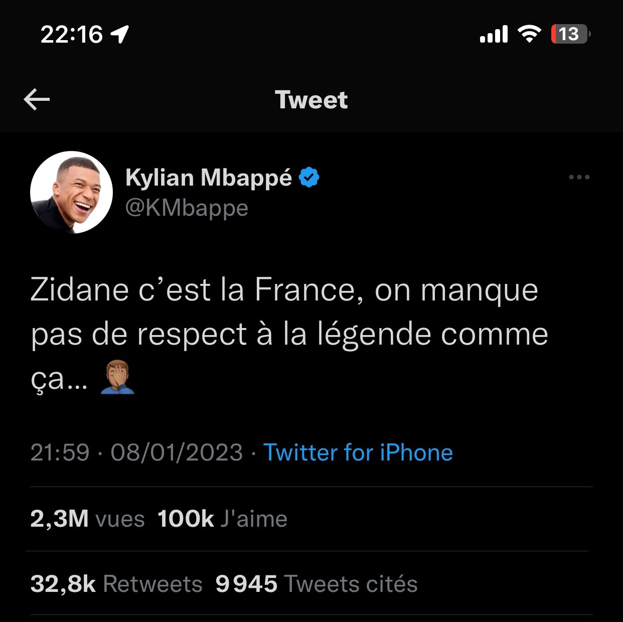 Dans la foulée de la révélation de ces déclaration, Kylian Mbappé a posté sur Twitter : « Zidane c’est la France, on manque pas de respect à la légende comme ça… 🤦🏽♂️».
