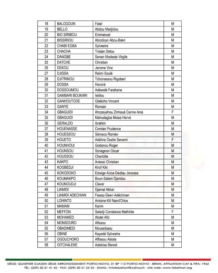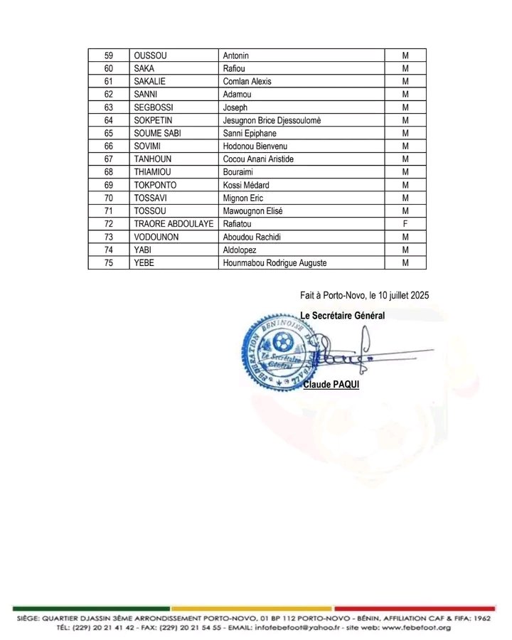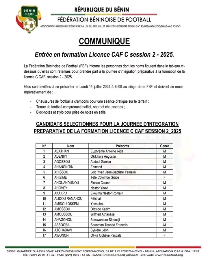 La Fédération Béninoise de Football (FBF) a publié la liste des candidats retenus pour la journée d’intégration préparatoire à la formation Licence C CAF – Session 02 – 2025. Cette information a été rendue publique par voie de communiqué officiel. Les candidats sélectionnés sont attendus le lundi 14 juillet 2025 à 08h00 précises au siège de la FBF à Porto-Novo. La présence à cette journée d’intégration est obligatoire pour tous les participants. Chaque candidat devra se munir de chaussures à crampons, d’une tenue complète de football (maillot, short, chaussettes), ainsi que d’un bloc-notes et d’un stylo pour la prise de notes. Cette journée d’intégration marque une étape préparatoire essentielle avant le démarrage effectif de la formation Licence C CAF – Session 02 – 2025.