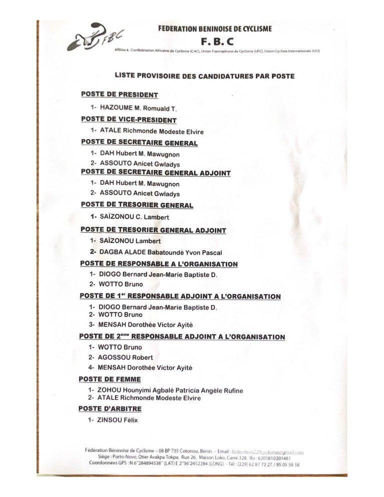 La Fédération Béninoise de Cyclisme (FBC) a validé les douze candidatures déposées pour le renouvellement de son comité exécutif. Ceci, conformément aux appels lancés les 18 avril et 8 mai 2025. Le scrutin est prévu pour le 7 juin prochain.