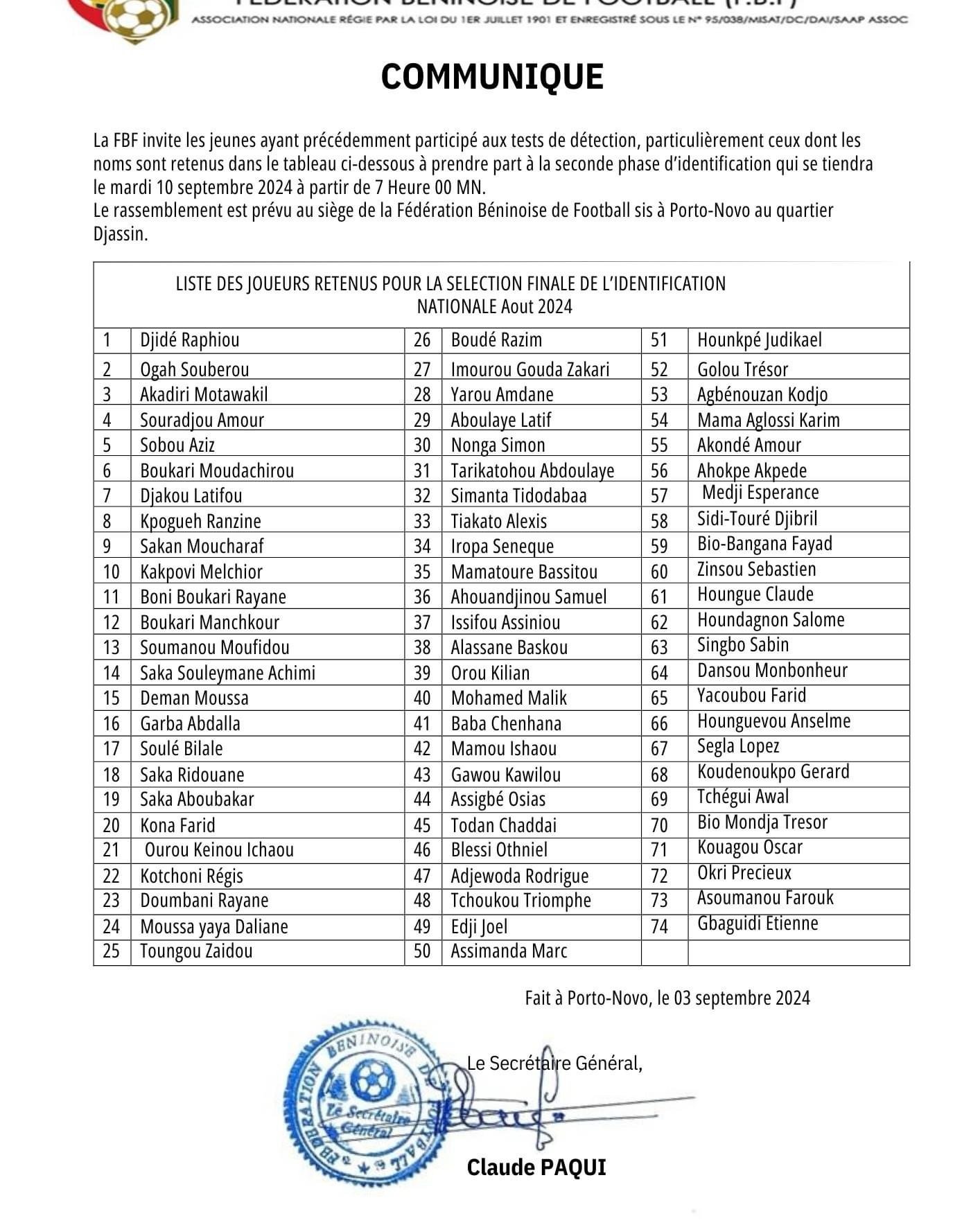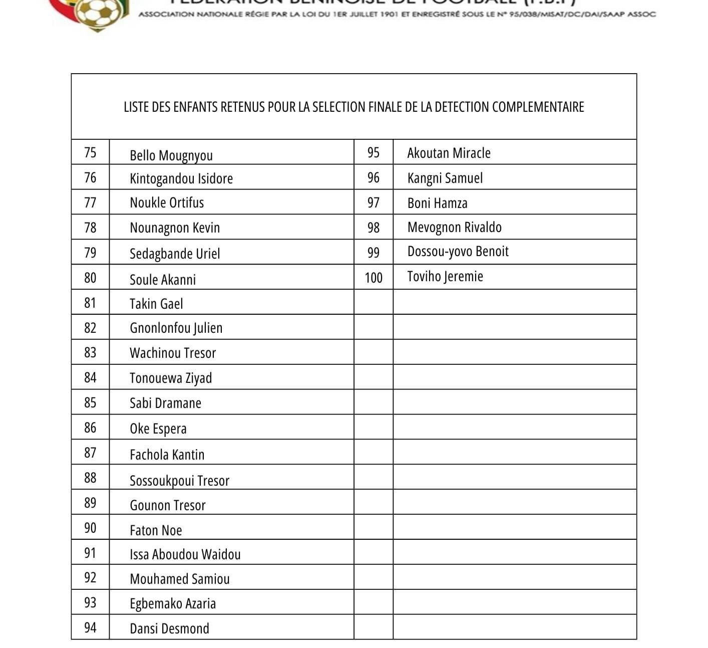 La Fédération Béninoise de Football (FBF) invite les jeunes ayant participé aux tests de détection, y compris ceux figurant sur les listes initiale et complémentaire, à prendre part à la seconde phase d’identification. Cette phase se déroulera le mardi 10 septembre 2024 à 07h00 au siège de la FBF, situé dans le quartier Djassin à Porto-Novo. Le stage se terminera le 14 septembre 2024 à 12h00 au Centre Catholique OUNADO. Les participants doivent se munir des éléments suivants : une tenue de change, une tenue de sport, des claquettes, une serviette de douche et une trousse de toilette. Ces éléments sont obligatoires pour la participation.