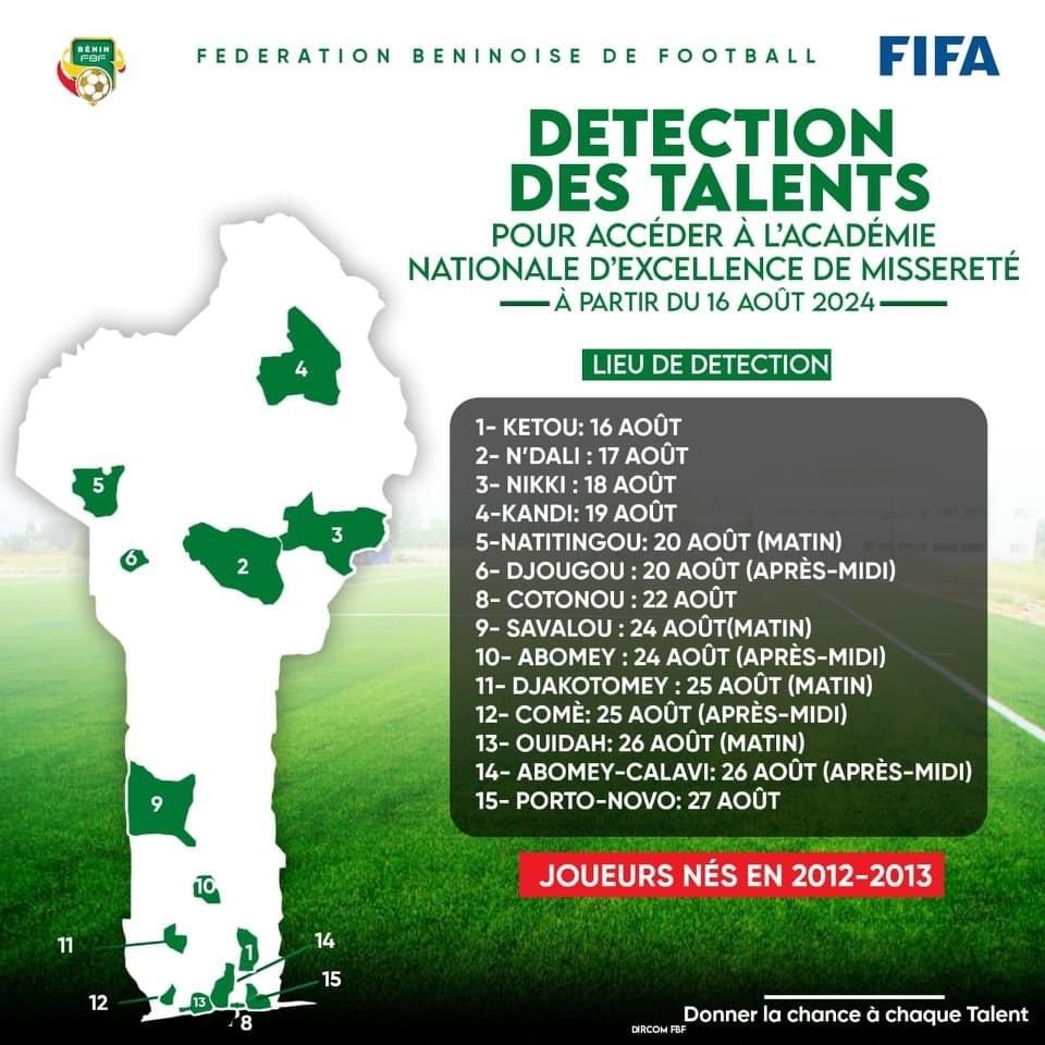 La Fédération Béninoise de Football (FBF) a annoncé, ce mercredi 14 août 2024, le lancement d’une vaste campagne de détection des jeunes talents pour intégrer l’Académie Nationale d’Excellence de Missérété. Cette initiative débutera le 16 août 2024 et vise à repérer les meilleurs footballeurs nés entre 2012 et 2013.